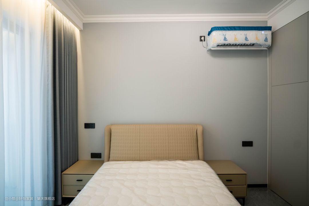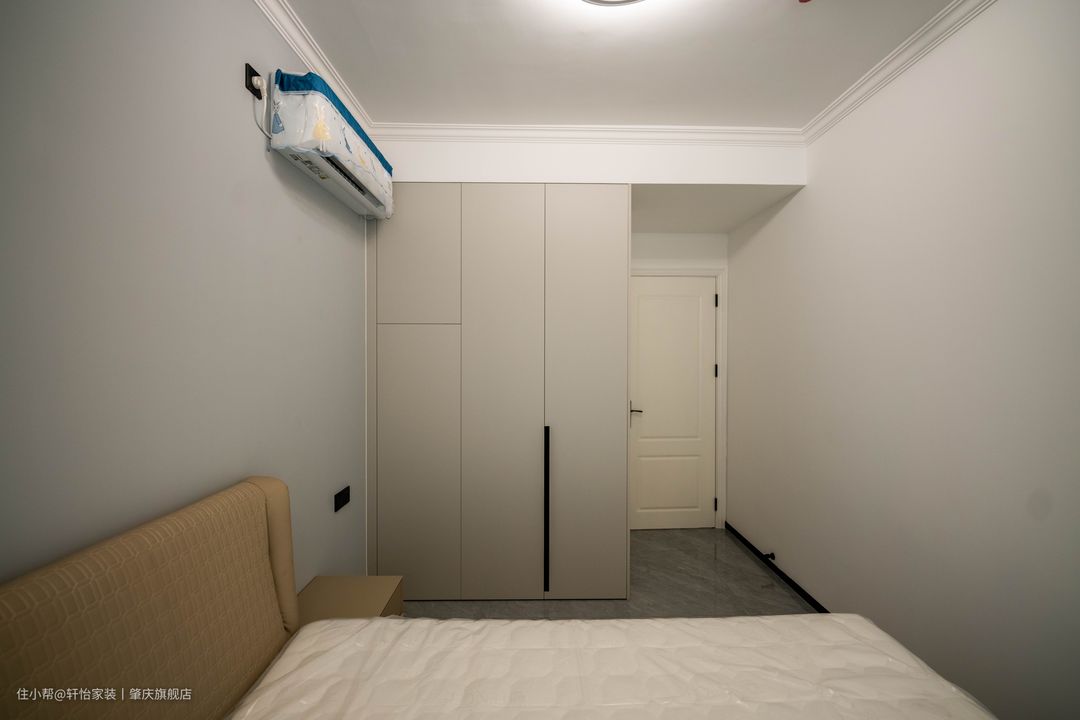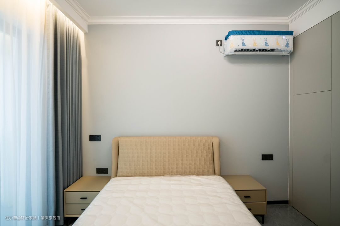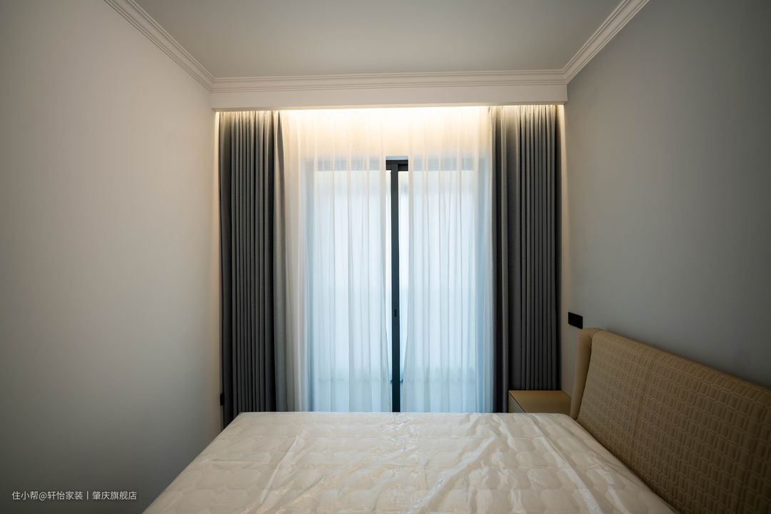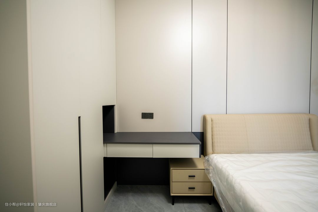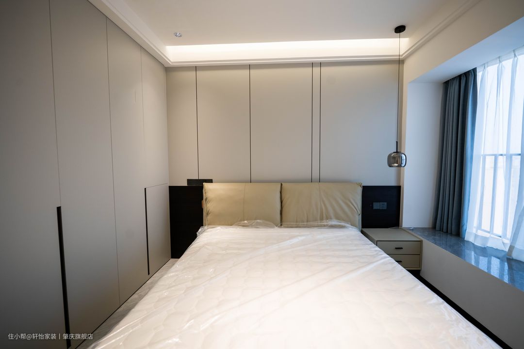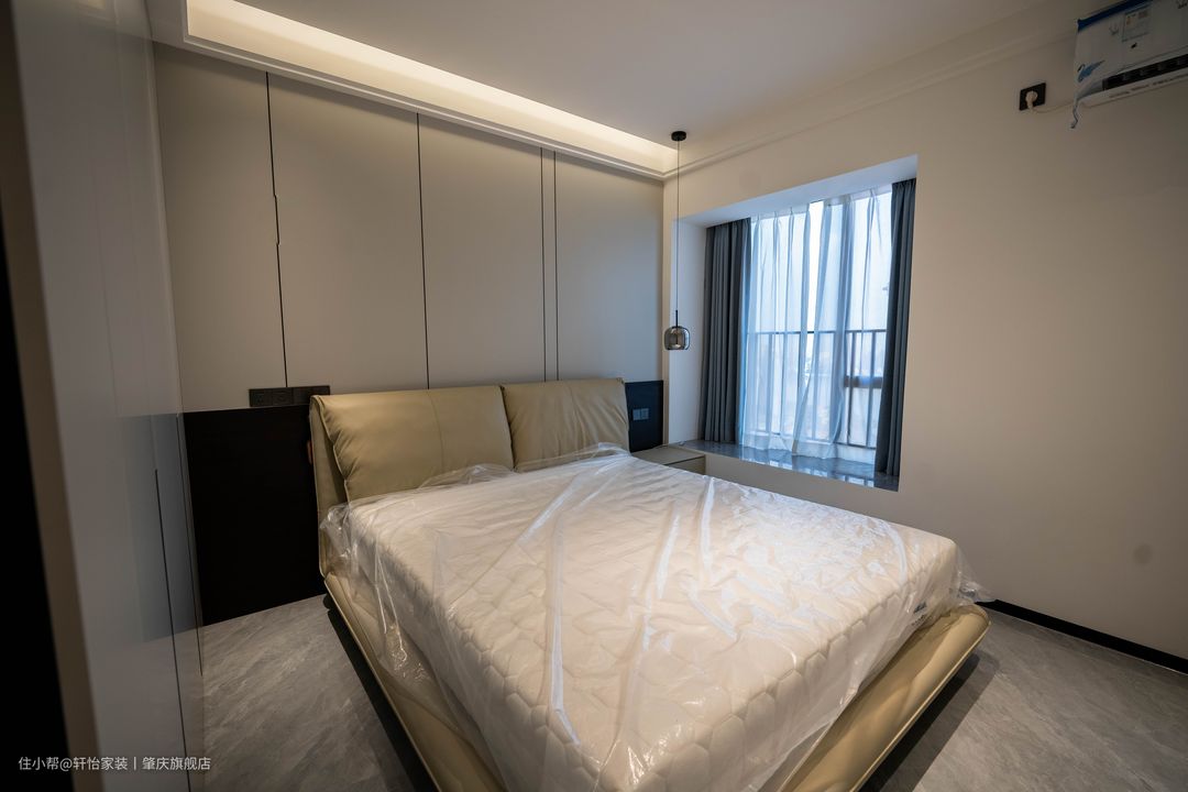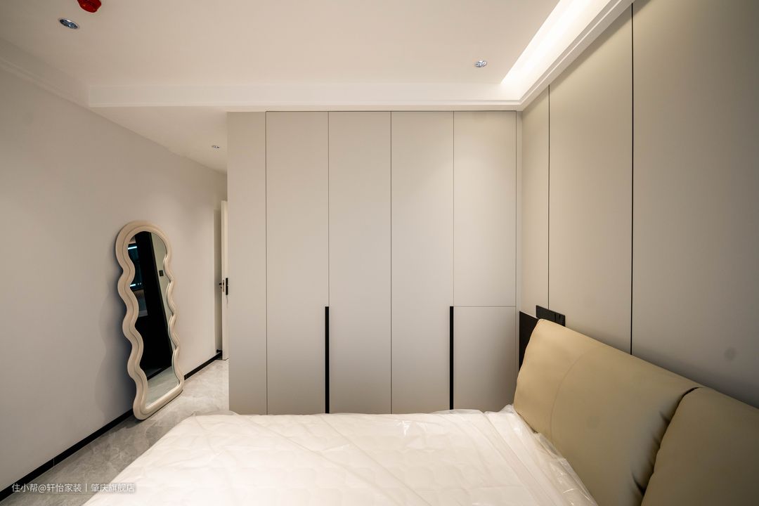 映入眼帘的是到顶衣柜,床头墙跟衣柜做相同的风格处理,让两者融为一体,黑色的半墙配上驼色的软包床头更有层次感。 天花的灯带是主卧的主要光源,一字长条玻璃吊灯凸显线条美,飘窗做了双层窗帘,遮光窗帘加上柔和的灯光营造舒适的睡眠环境。 在进门放置了一个全身镜,不规则设计加上白色包边,既有特色有符合空间整体风格。