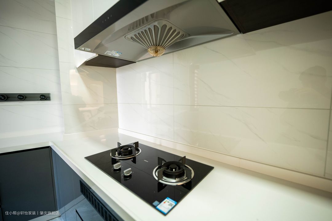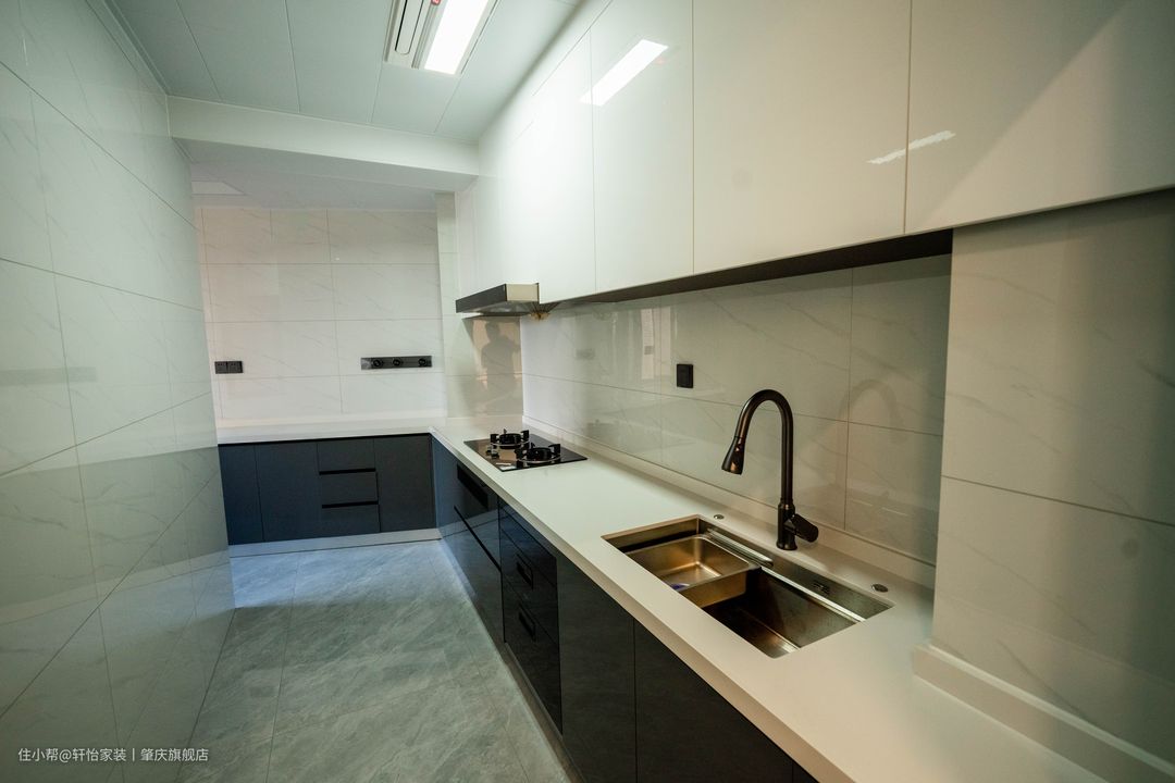 厨房的空间比较特殊,细长且不方正,所以沿着墙面做橱柜是最好的选择,L型的橱柜解决了异形空间的劣势。 多功能洗碗盆加上可伸缩抽拉式水龙头简直是厨房一大利器,烹饪体验感直接拉满! 在最里面装了一个净水器,保障生活用水,厨房需要用到的家电比较多所以在墙面多出设置的插座,更方便生活。