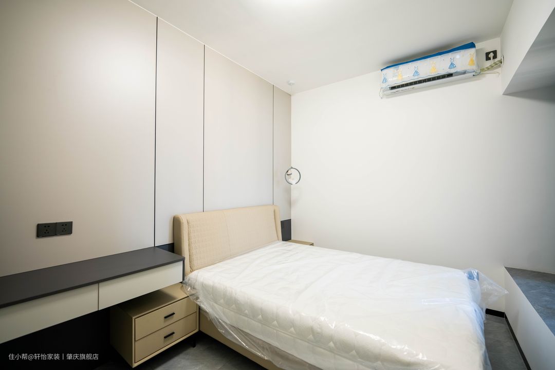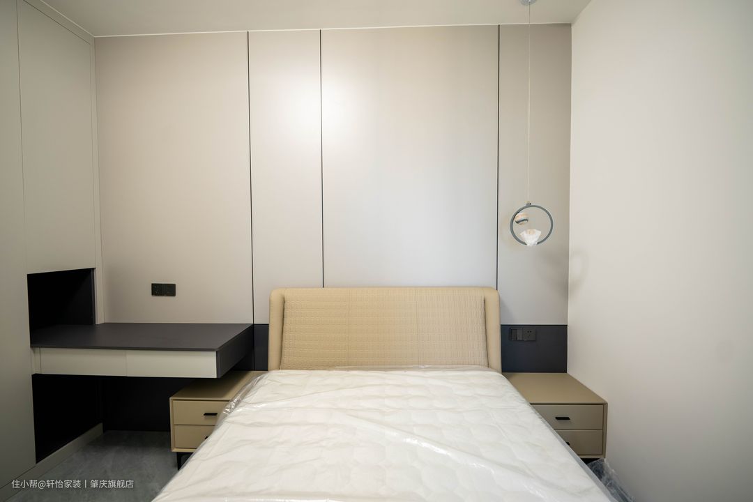 儿童房延用主卧的装修风格,小方格的软包床头增加舒适感,卡其色的配色更显温馨,卡通宇航员的小吊灯更偏小朋友喜爱。 到顶的衣柜可以容纳四季的衣物,隐形内嵌把手设计把极简发挥到了极致,从衣柜延伸出来的书桌更有设计感,合理利用空间,黑白的配色与床头墙色彩相呼应。