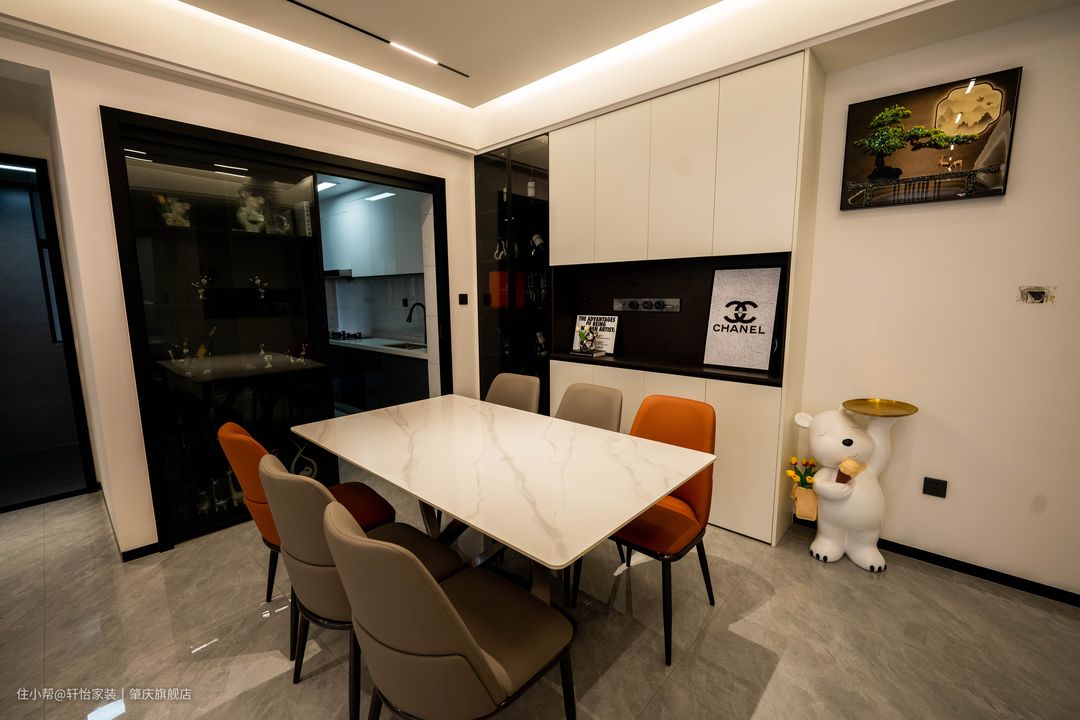 大理石花纹的餐桌加上皮质餐椅更显品质,方形餐桌可以容纳更多人就餐,平常招呼亲朋好友也不在话下!橘色跳色的餐椅,小心机的处理让空间气氛更活跃。 到顶的橱柜实现储存空间的最大化,白色无拉手的柜面和黑色玻璃门的酒柜,黑白配色经典又不过时。 在餐柜中间做了开放格处理,同样黑色的台面与酒柜衔接的恰当好处!放置黑白字母装饰画,更有高级感。