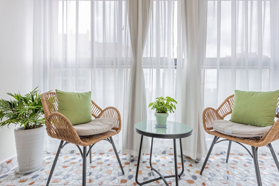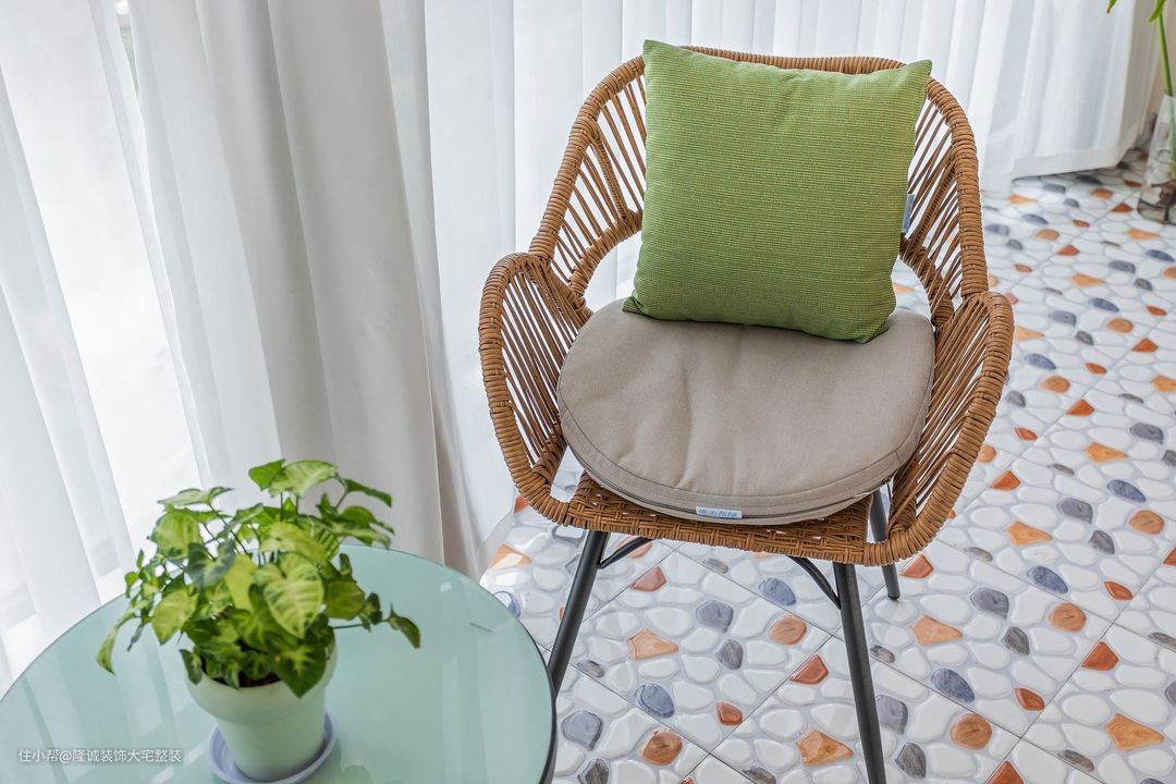 阳台是小姐姐比较喜欢的放松之地,波西米亚风小格纹转搭配藤编凳椅,苹果绿+清新蓝,天生一对