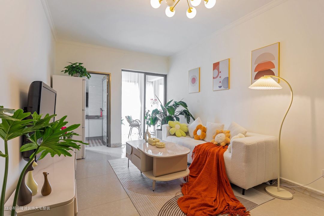 绿色北欧风盆栽作为点缀,客厅沙发采用奶白色搭配同色系茶几,以花朵抱枕和爱马仕橙色沙发毯作为撞色,整体高级又清新