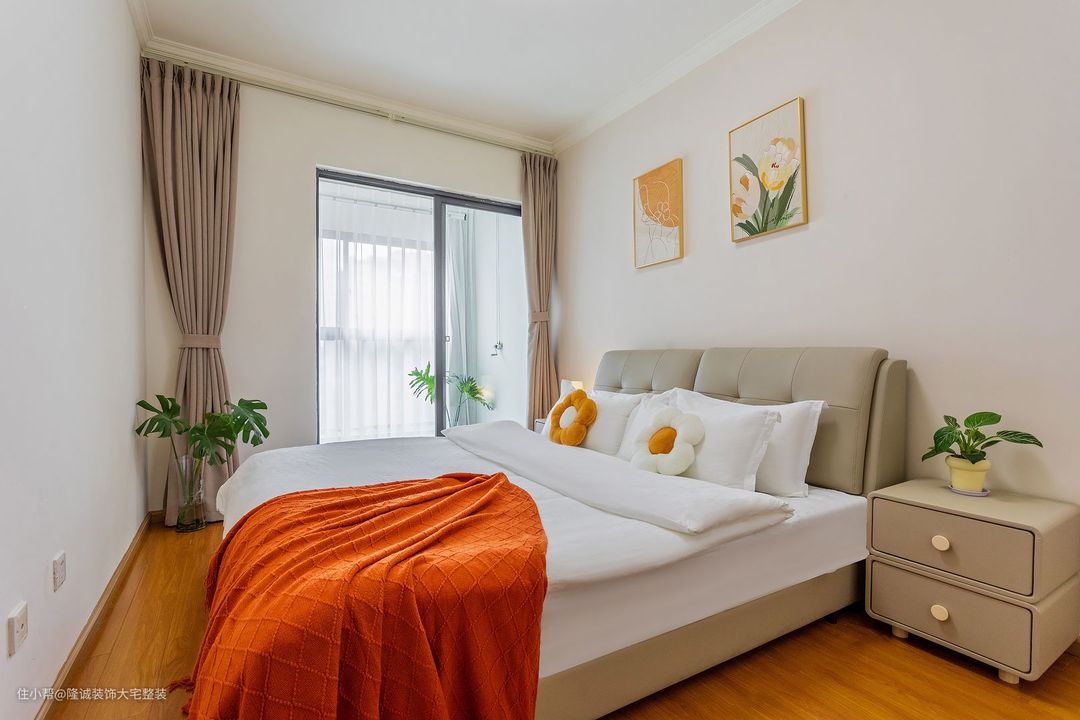 主卧室不是很大, 床头靠背做皮质感,给人一种质感舒适的感觉。 床靠墙放置,更加紧凑实用。 花朵系列保证搭配橙色系毛毯,为整个空间提供了色彩感