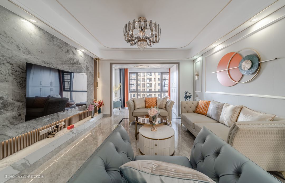 电视机背景墙区域,兼顾美观与实用功能。用大理石结合木格栅,再加上地台;旁边利用多余的空间来做展示柜,加上灯光氛围烘托。在充分利用空间的前提下,真正实现了美观与功能并存。 沙发背景区域,整体用石膏线做了矩形造型,增加了空间的丰富性。再加上顶部和两旁的灯光烘托气氛,这样比较有感觉。在软装上了选用了美式和欧式的沙发来进行搭配,与背景墙的契合度比较高。