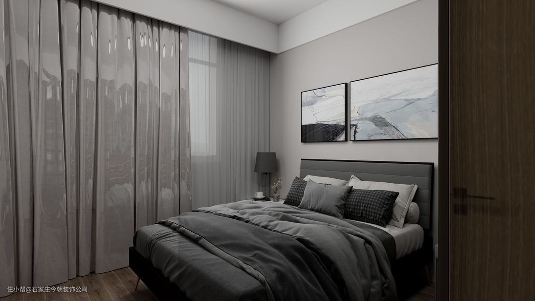 卧室上去繁从简,视觉上简洁统一,不失高级感。床头背景墙刷了乳胶漆加上挂画的设计不会显得单调,窗帘我们采用的透光不透人的梦幻帘,搭配灰色遮光帘,简约好看,白天也可以美美的睡一觉。