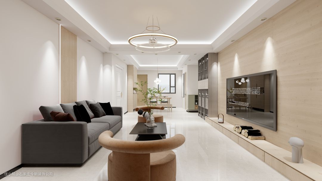 全屋以温柔的原木色为主色调,客厅选择浅灰色的模块沙发搭配棕色的圆弧形沙发,打造出温暖舒适又治愈的客厅~ 简约大气的电视背景墙,选择原木色格栅设计搭配灯光设计,视觉上非常的大气高级又温馨,配搭可摆件,趣味性十足~