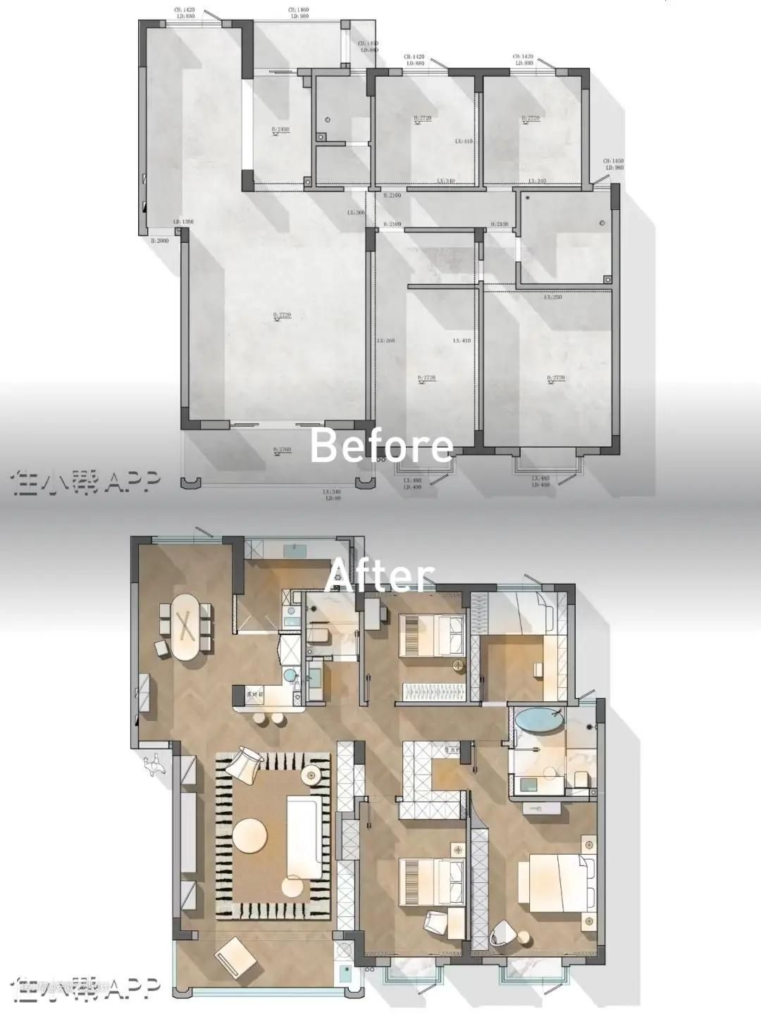 ①沙发墙规划嵌入式柜体,大大提升空间收纳力,家里也更加整洁、美观; ②餐厨有效整合,规划餐吧区,增加空间的功能性; ③重新划分南次卧,为主卧增加小衣帽间,提升收纳能力,让生活更加有序。