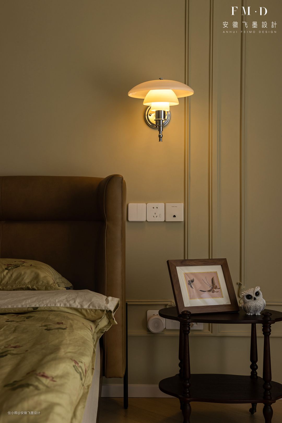 一张黄棕色床靠放于墙,床头两侧,两盏蘑菇壁灯熠熠生辉,宛如夜空中的明星,照亮了每一个黑暗的角落。左边还放了个不锈钢边柜,满足物件存放需求的同时,也使得整个空间不再单调乏味。