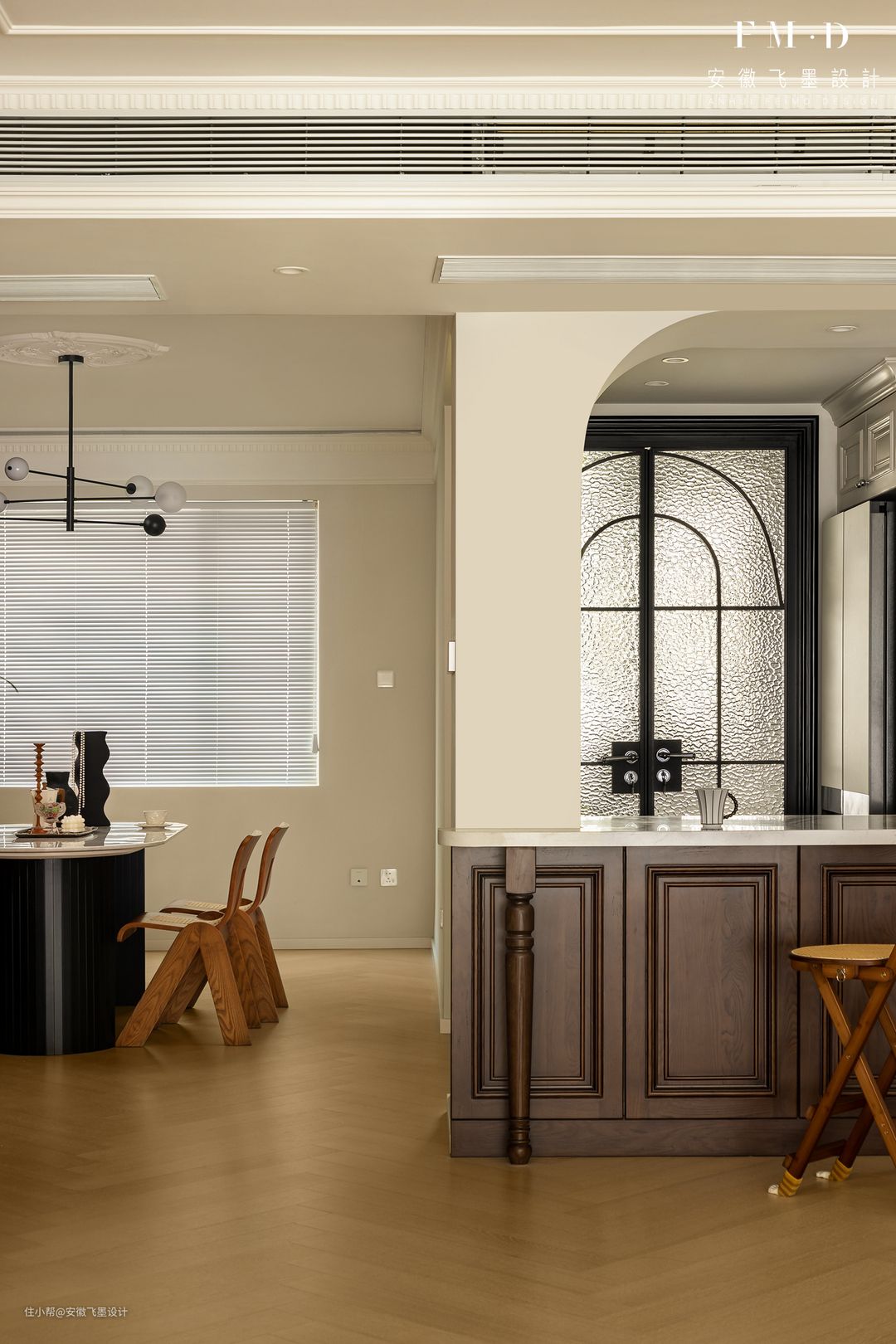 餐厨空间进行了重新规划整合,并在厨房门前增设了一个西厨餐吧区。复古胡桃木与石材相互交错,形成了独特的视觉效果,而承重柱则被巧妙地设计成了拱形窗洞,在这用餐仪式感满满; 黑框与水波纹玻璃的双扇门,将空间巧妙地分隔,同时又赋予了厨房独特的艺术气质。厨房橱柜呈L型布局,从左至右依次为洗碗池>备餐区>灶台,做饭动线合理不说,奶茶色的橱柜如同一个收纳宝箱,将所有的厨房用品井然有序地收入其中,既美观又实用。