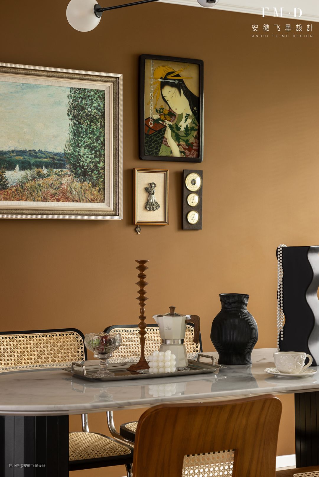 三餐四季,在这美拉德色系的餐厅中,一张椭圆餐桌居中摆放,搭配藤编餐椅,即使在寒风凛冽的冬季,也能给人带来温馨的视觉享受。餐桌上方,一盏分子吊灯摇曳生姿,当柔和的灯光洒落在桌面上,宛如繁星点缀夜空,为用餐增添了一份诗意和浪漫。墙面上,几幅油画点缀其中,犹如生活中的点点回忆,瞬间让整个空间生动起来。