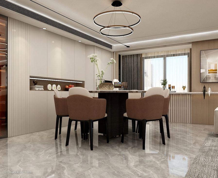 厨房的整体设计采用了一种独特的上白下深的柜体形式。大理石覆盖了整个台面区域,营造出尊贵且和谐的整体氛围。烟道的周围被精巧的木饰面所包围,进一步提升了整个空间的美观度和高级感。顶层采用了创新的蜂窝大板造型,并巧妙地进行了颜色的过渡处理,极大地增强了空间的层次感和质感。在柜体衔接处,设计师特别设计了弧形的地柜,不仅方便实用,还增添了一份别致的设计感。强大的收纳功能,与华为全屋智能面板和开关的结合,使得面板可以实现多种功能,在保证功能实用性的同时,也提升了整个空间的美感。设计中采用的功能六合一和场景随心换的创新理念,真正实现了十大系统的全面覆盖,充分满足商家的各种需求。
