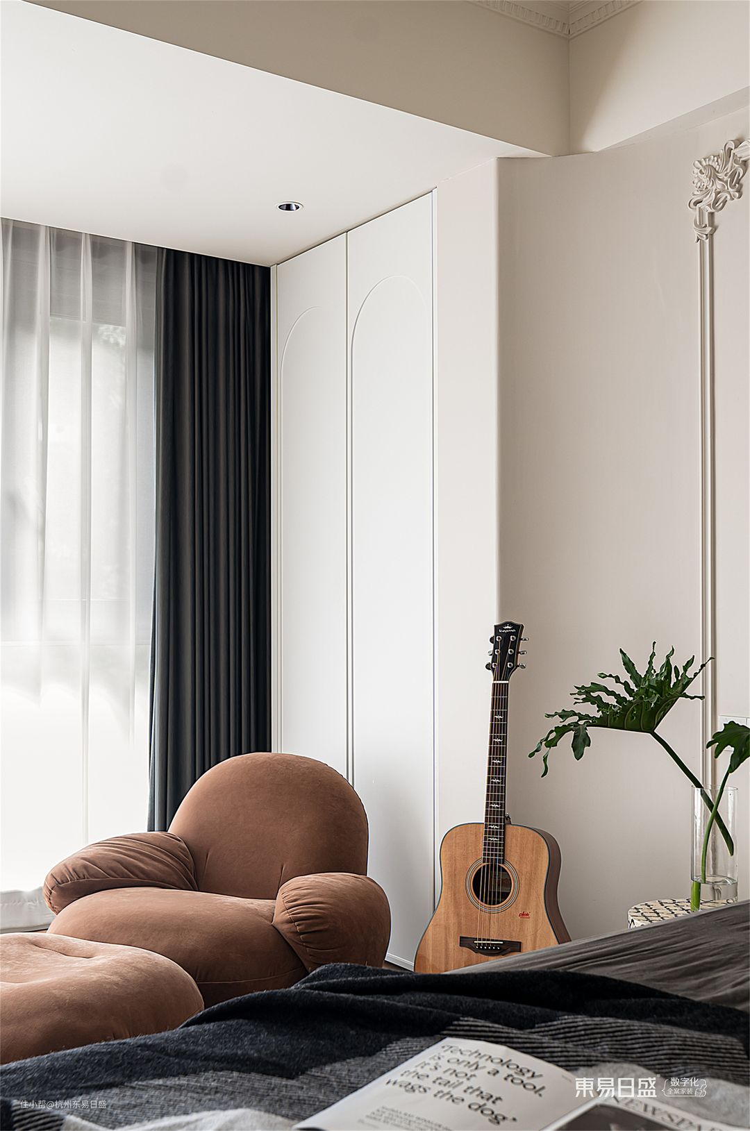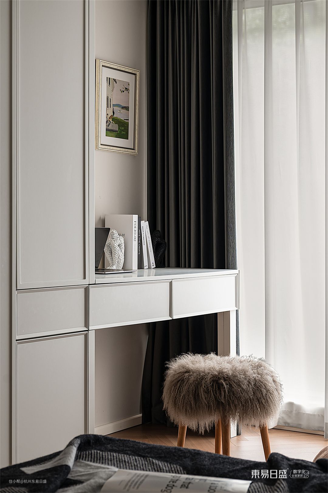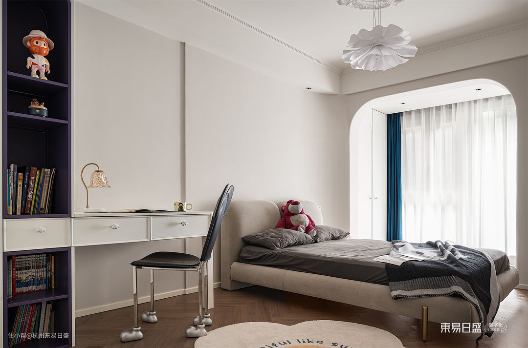 卧室阳台打通处巧妙地布置了一个休闲音乐角和延伸梳妆台区,与整体空间无缝融合,为卧室增添了一道迷人的景致线。整个空间中充盈着现代法式的浪漫和精致,让人陶醉其中,享受那份宁静与舒适的美好。