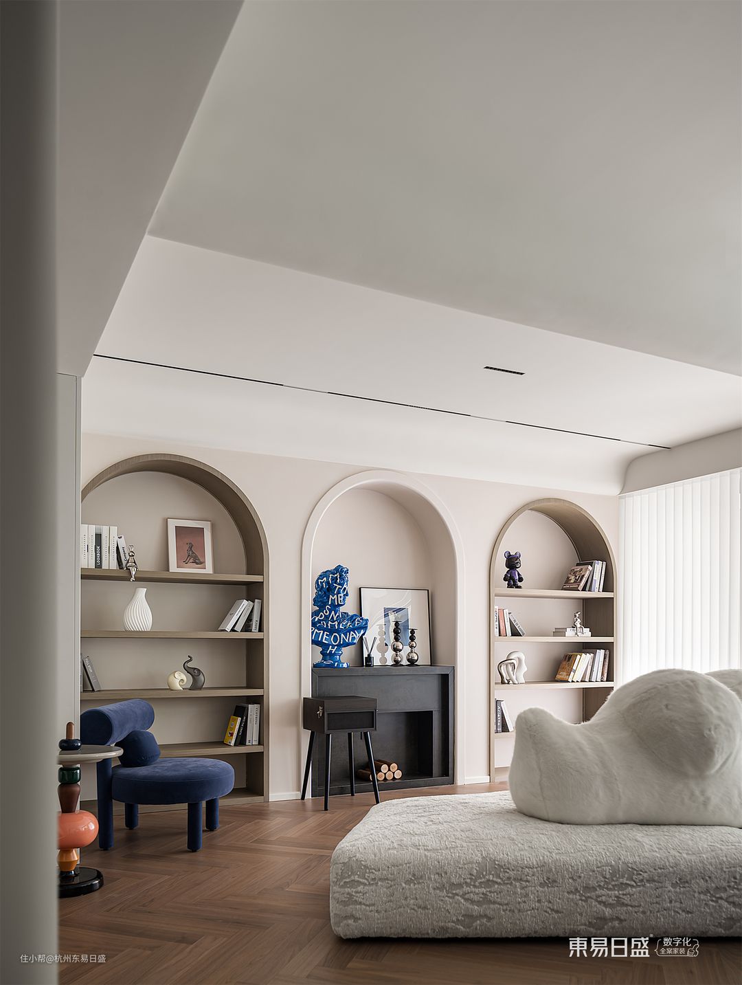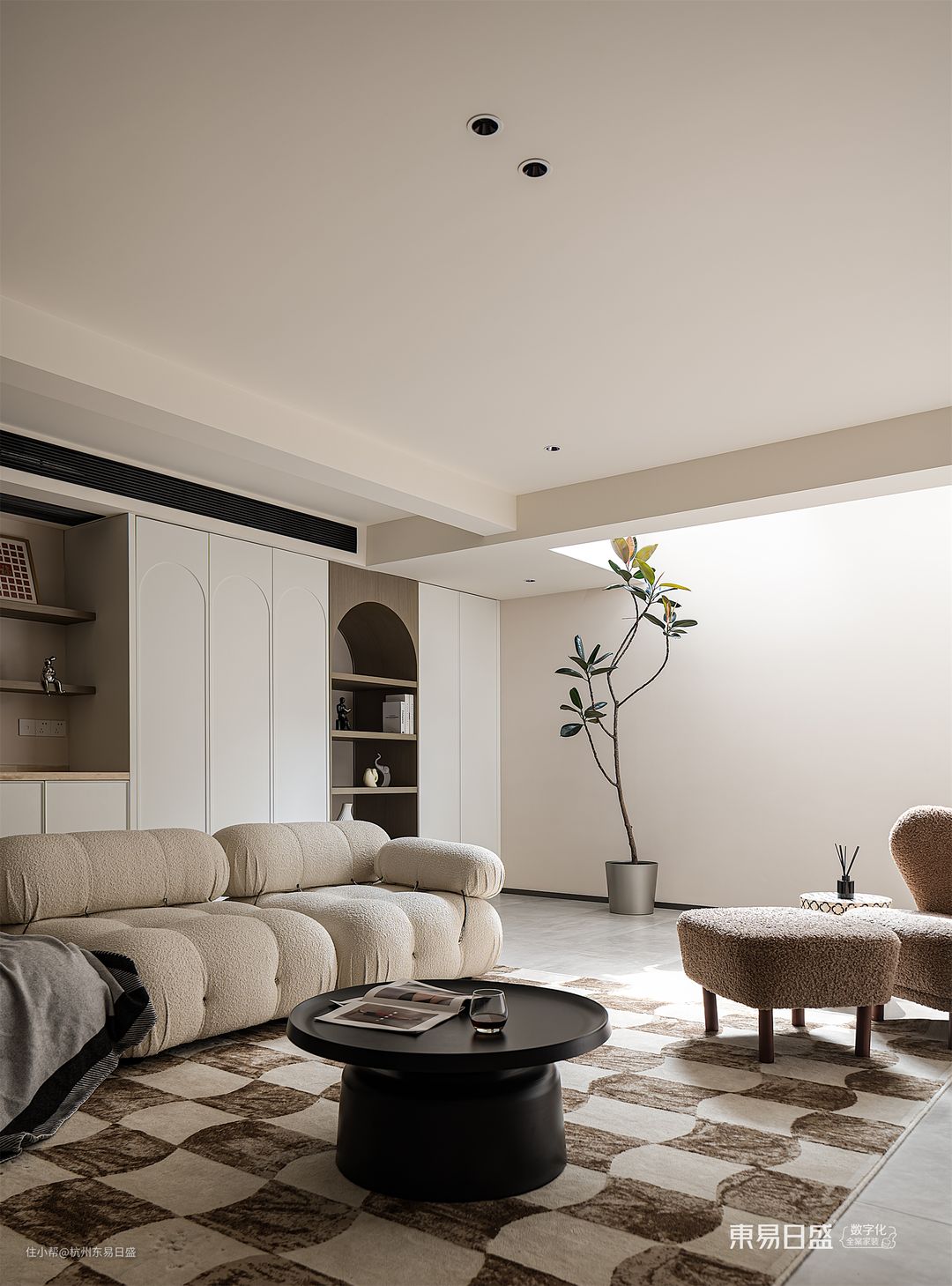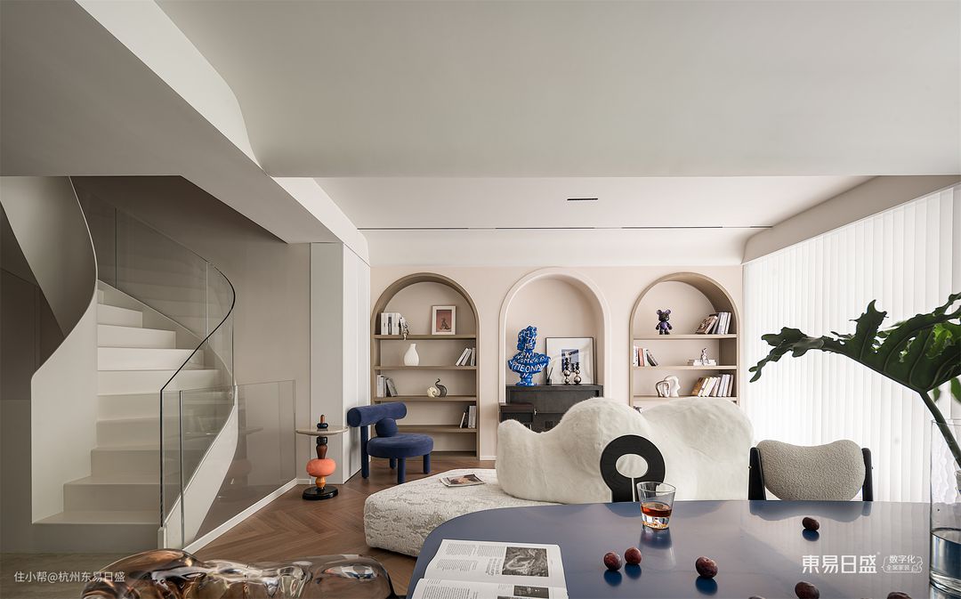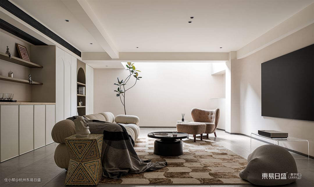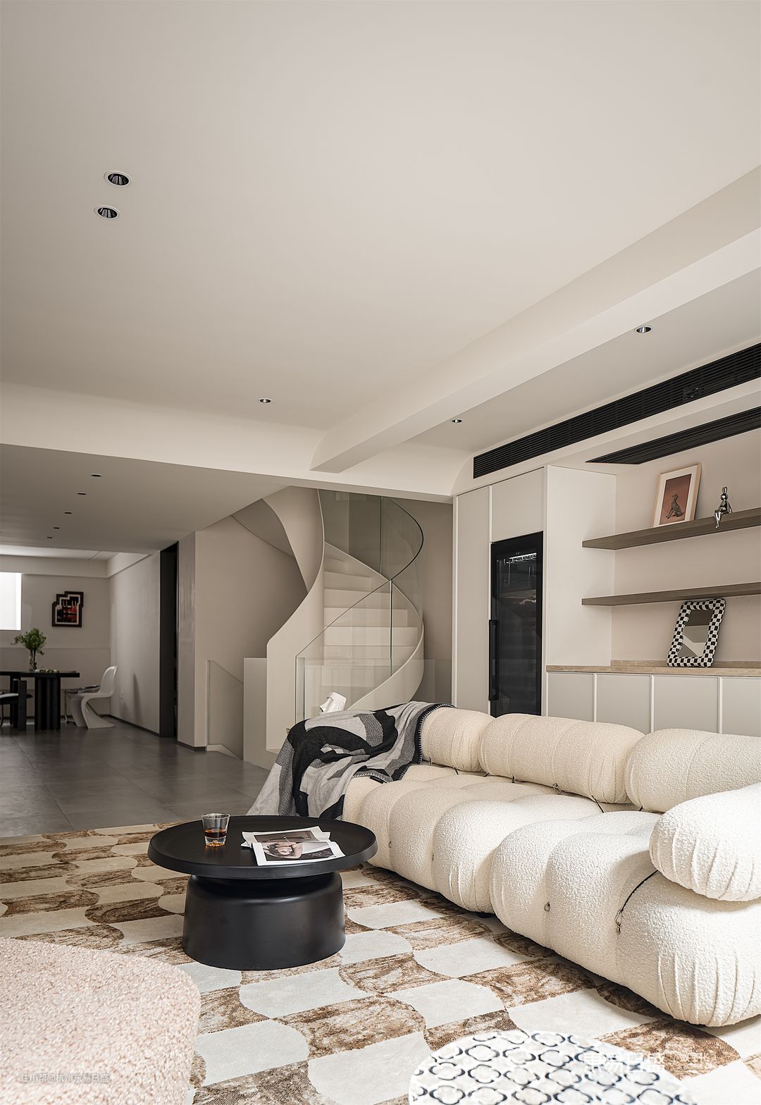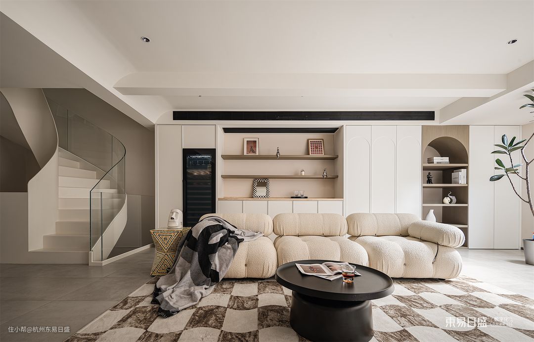 负一层空间,设计师将整体风格定位为清新、朴实和宁静的侘寂风。为了赋予空间更多的温馨感,设计师巧妙地加入了一些温暖的奶油色调。硬装部分运用了曲线和弧面的设计,色彩搭配以米白为主,保留了自然的本色。软装方面,简约线条和柔软材质的家具成为主打选择。软硬兼施,融合了朴素之美与温柔之感,呈现出一种低调而上乘的品质感。