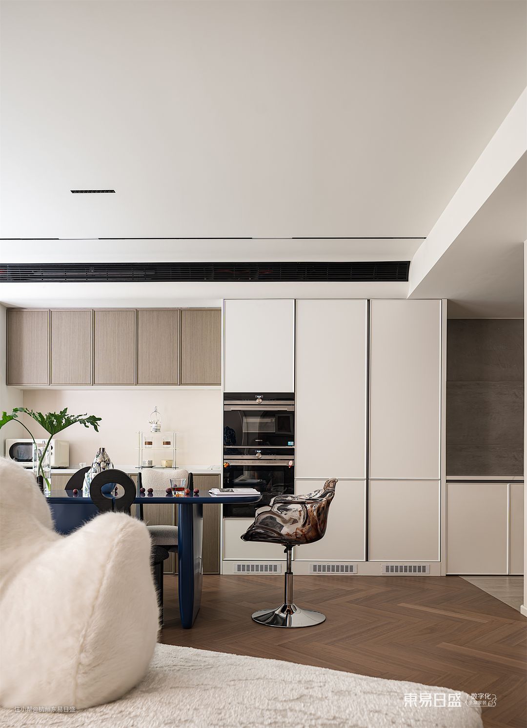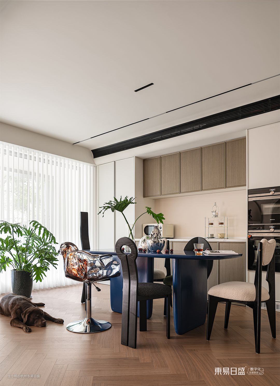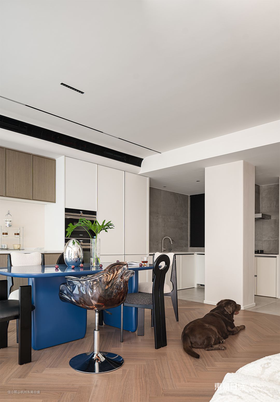 在法式侘寂风餐厅的毗邻,一只身披玄色马甲的小狗,就像一位尽职尽责的守卫者,静静地守候在角落,默默地守护着这个家中的温馨与和谐。餐桌的颜色如同深邃宁静的海洋,上面摆放着精美的装饰品,四周摆放着与众不同的餐椅,仿佛一幅超脱凡俗的静物画,散发着浓郁的生活气息。