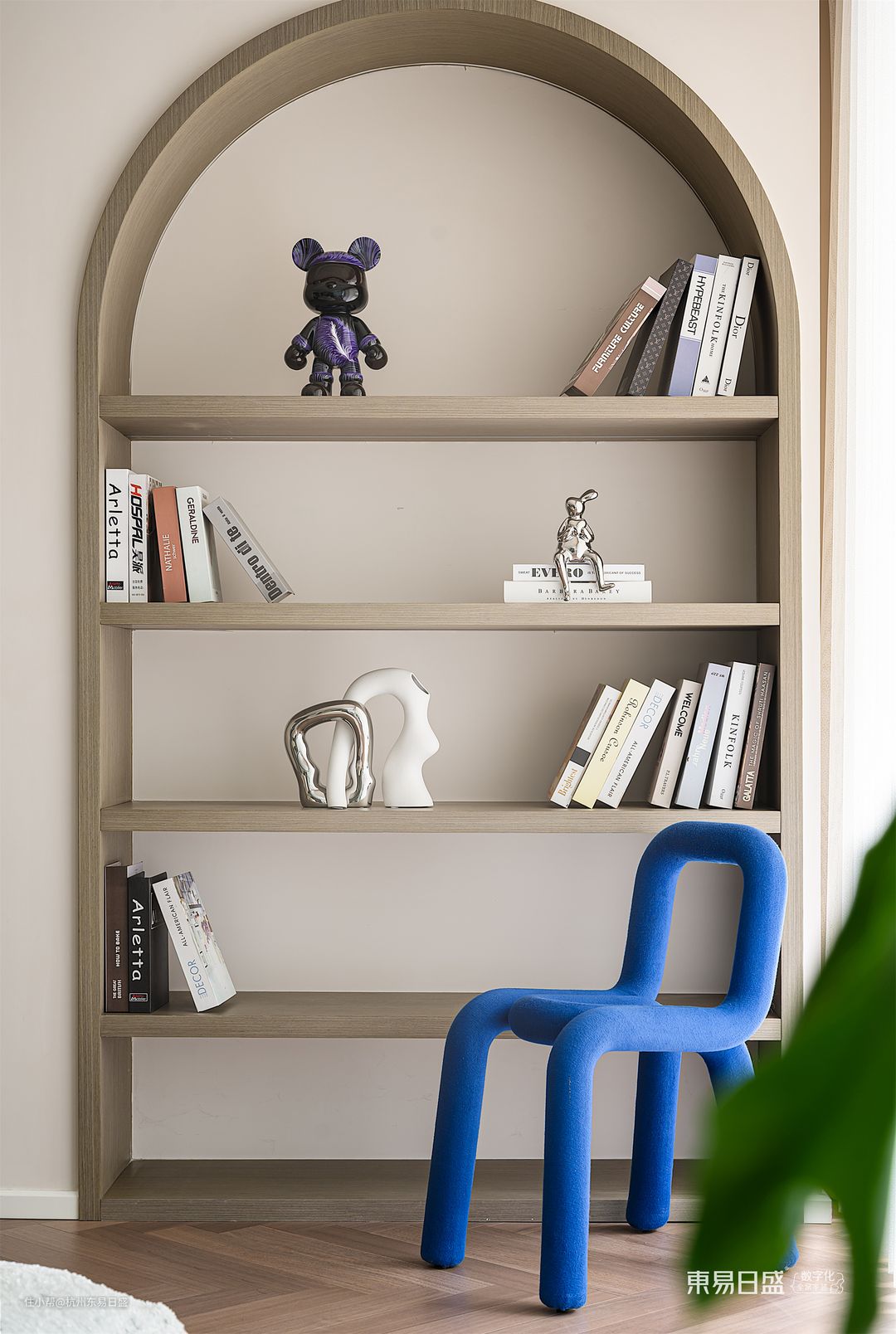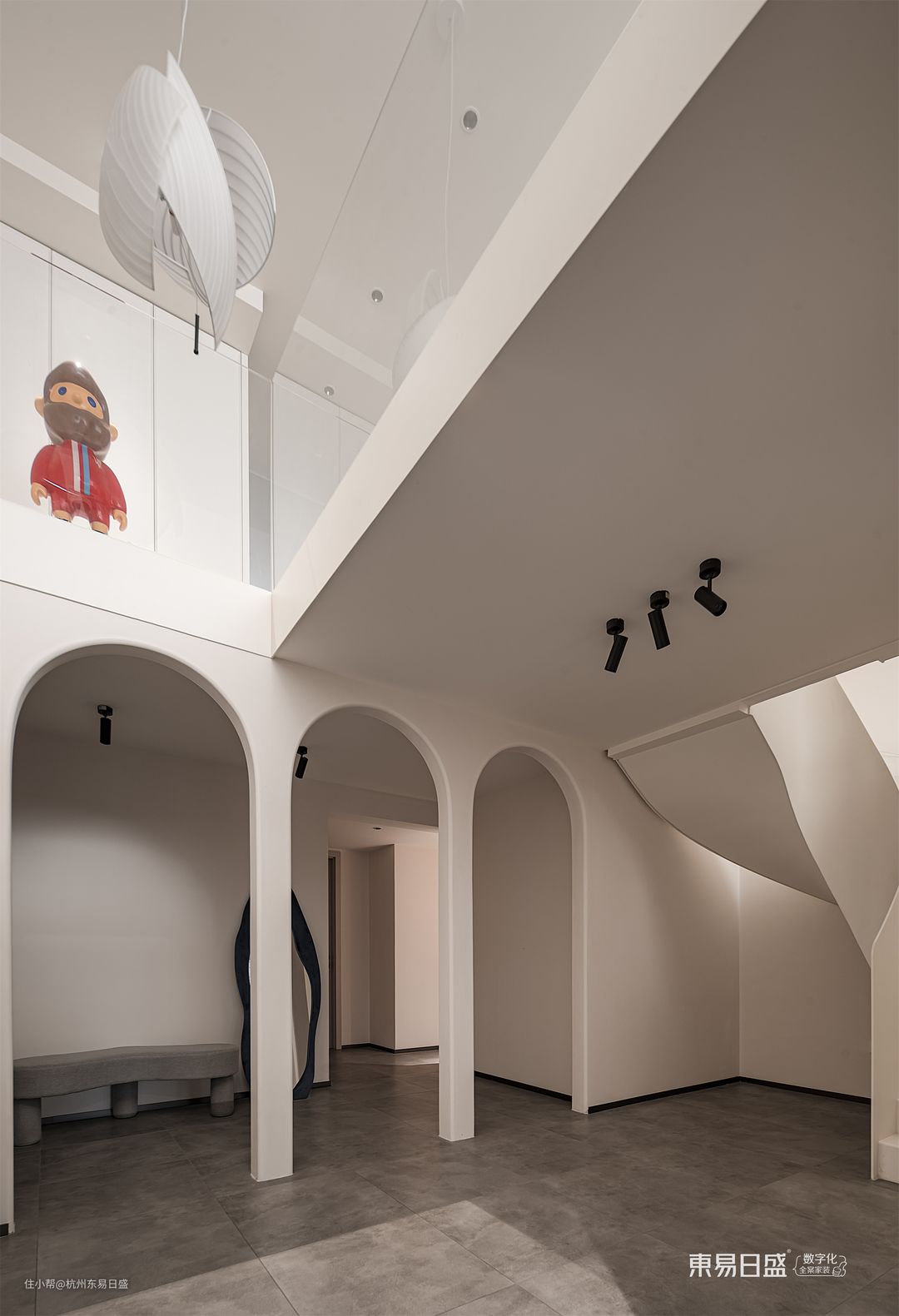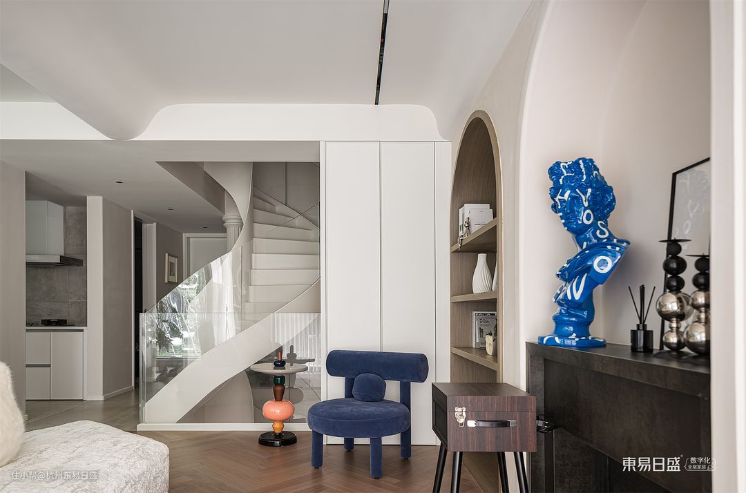 负二层门厅以侘寂的独特表达观念,将视觉的高级感完美呈现。在这里,轮廓、材质与光影的搭配相得益彰,让人流连忘返。造型穿衣镜在拱形门洞中若隐若现,宛如一幅艺术品,将艺术与生活融为一体。同时,随处可见的弧形线面增添了流动的自由,让空间更加灵动。