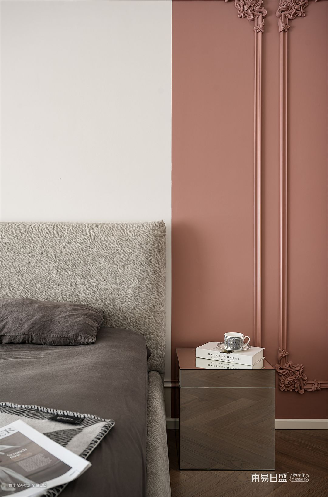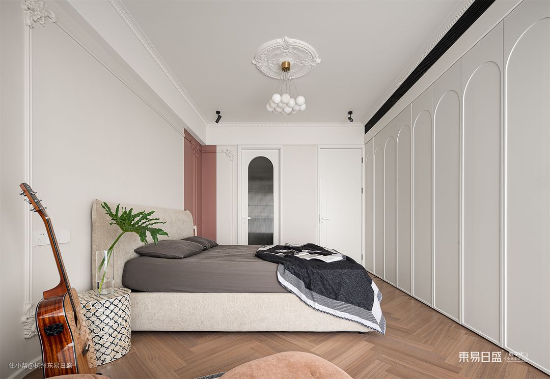 卧室以纯净的白色为主色调,简单而雅致。背景墙一侧采用独特的橘粉色造型,为空间增添了一抹生动的色彩。墙壁上精致的石膏线条雕刻,融入法式元素,为生活增添了一份精致与高贵。人字拼接的地板与白色床尾一体柜相得益彰,不仅增强了空间的整体感,还延伸了视觉效果。