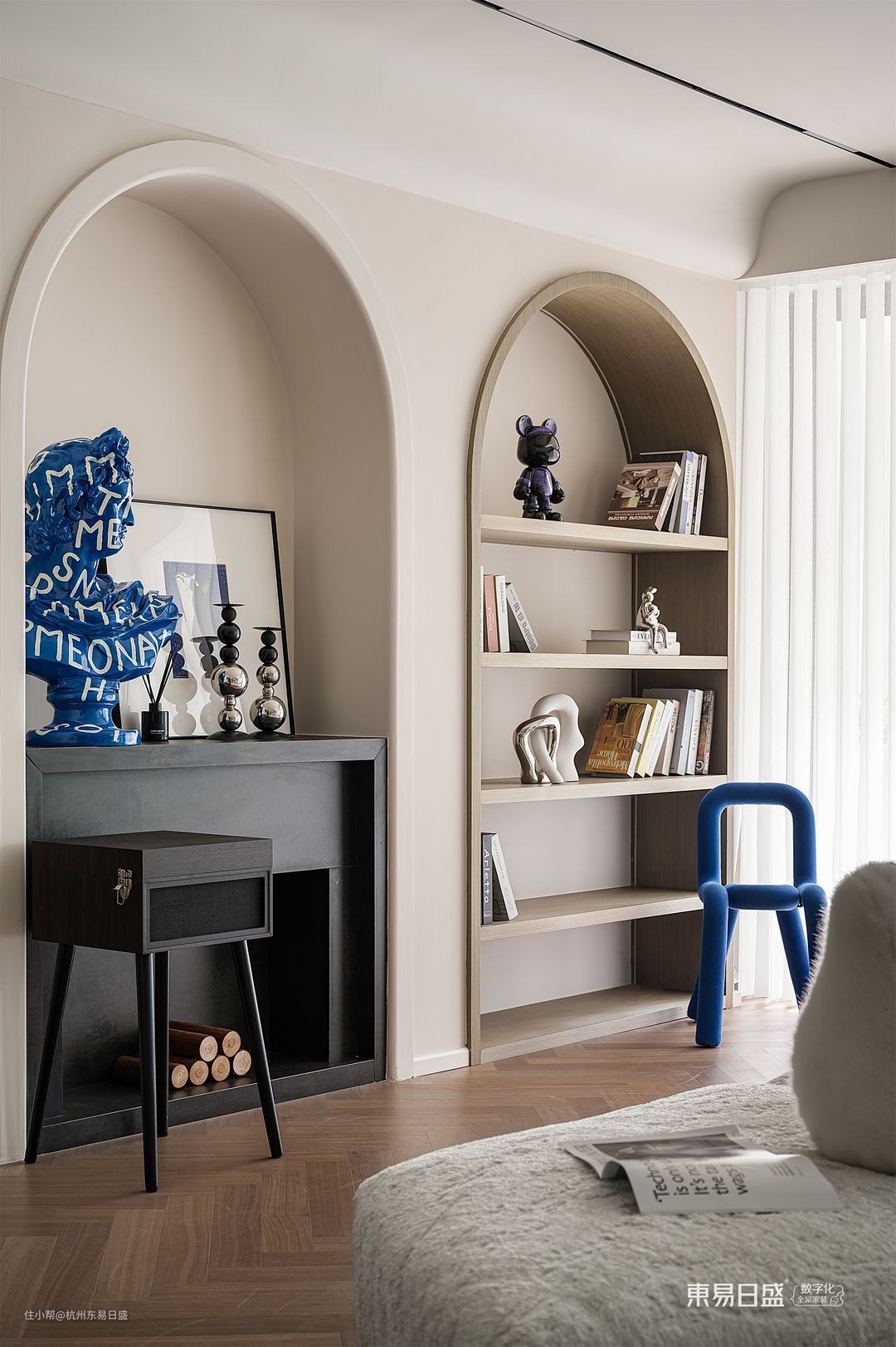 沉醉在原木色系地板的温暖怀抱中,我们被蓝色与黑色的优雅所吸引,它们诉说着静谧而高级的氛围,为家具注入了独特的灵魂。设计师精心挑选的edra pack沙发坐落在客厅中央,经过阳光特殊染色后,散发出更加活泼有力的气息,让人忍不住想要靠近,感受它带来的舒适与温暖。