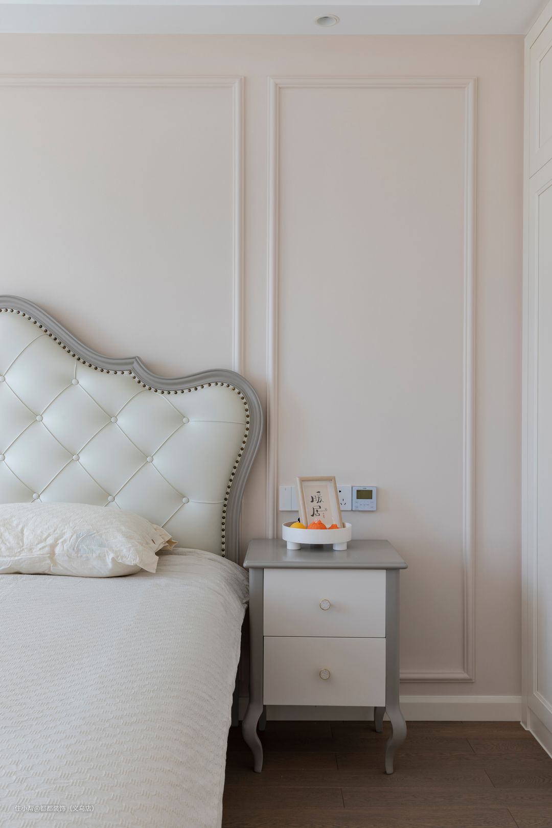 主卧背景墙也采用了白色石膏线在墙面大面积铺陈,增加了空间的层次感,在视觉上也有放大空间的效果,地板以胡桃木色做搭配,深浅之中尽显美式大气。 饱满流畅的床头板和羊羔绒矮椅,将日常生活的田园浪漫与轻快调和的恰到好处,软乎乎的触感让人爱不释手。 钱小姐经常见客户需要穿的很正式,于是专门准备了一个衣帽间兼化妆台,可以放置各季衣物和包包,收纳力强,干净还整齐。