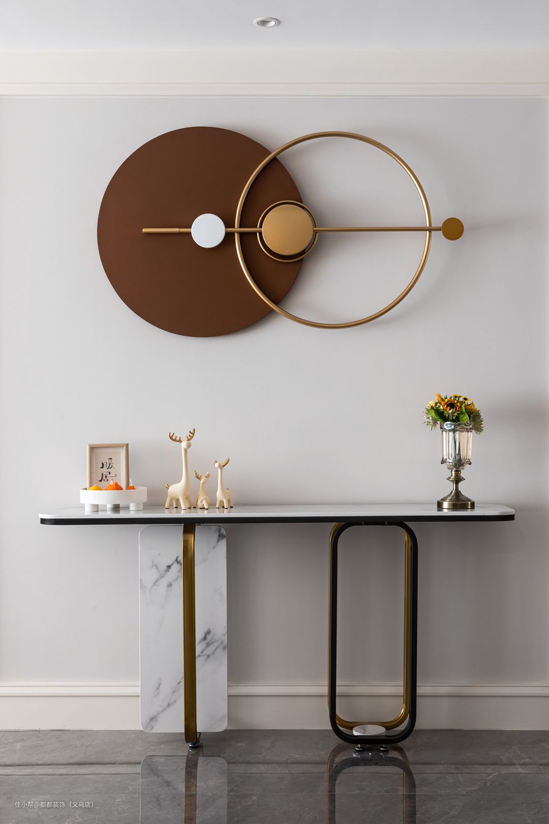户处的走廊宽度较窄,所以没有定制笨重的玄关柜,而是采用典雅的棕色铁艺壁饰和轻奢的玄关台打造不一样的墙上艺术,“暖居”黑墨字框和小鹿钥匙架传递着温馨、简朴的情感。