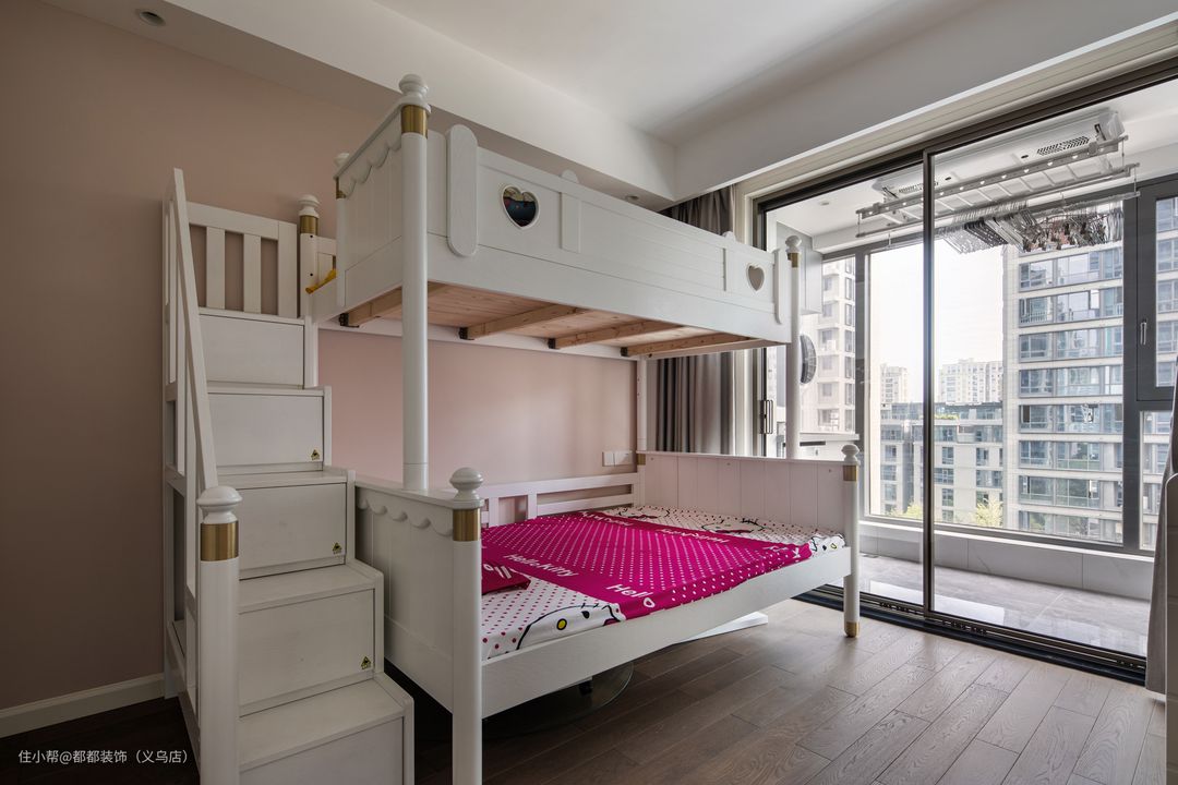 次卧是书桌+收纳柜+衣柜+床一体式设计,配色延续了客餐厅的白色与灰色的色彩感觉,在中间添加了缎面窗帘,使原本单调的材质变得活灵活现。 书桌的线条干练利落,不管是小清新的画框,还是甜美的鲜花盆栽,都装饰出了亦怀旧亦田园的雅致。 儿童房是粉嫩的双层床设计,一个床位的面积可以拥有两个床位的使用空间,对于小户型的家庭简直就是福音,上床铺作为休息区,下床铺做为娱乐区,不仅可以使儿童房的趣味性提升还能增加孩子的娱乐空间面积。 楼梯式抽拉的样式配合护栏,稳固又安全,左侧是错落有致的开放格收纳柜,能在日常生活点滴中培养孩子的独立个性和动手能力。