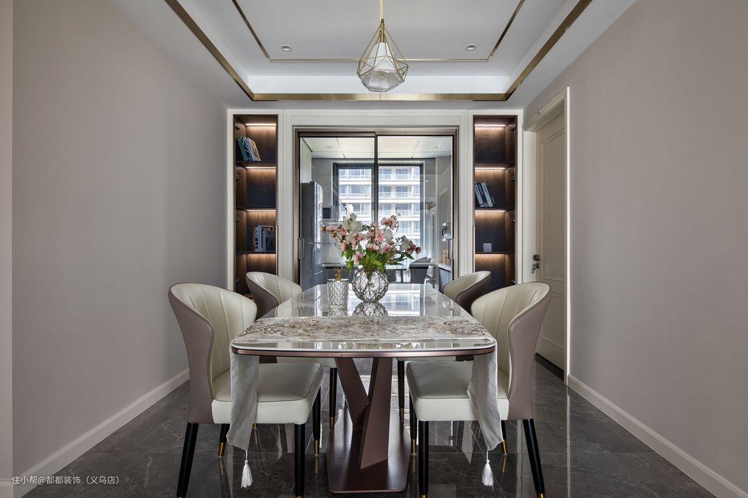 开放的就餐区给钱女士带来更多空间上的互动,生活画卷在此展开,大理石的餐桌线条秀雅有质感。 餐桌布添加了复古的碎花元素,分分钟化身为家里最靓丽的一道风景线,钻石切割造型的吊灯自然垂落,与芳香的花束构成和谐的画面,美得没话说!