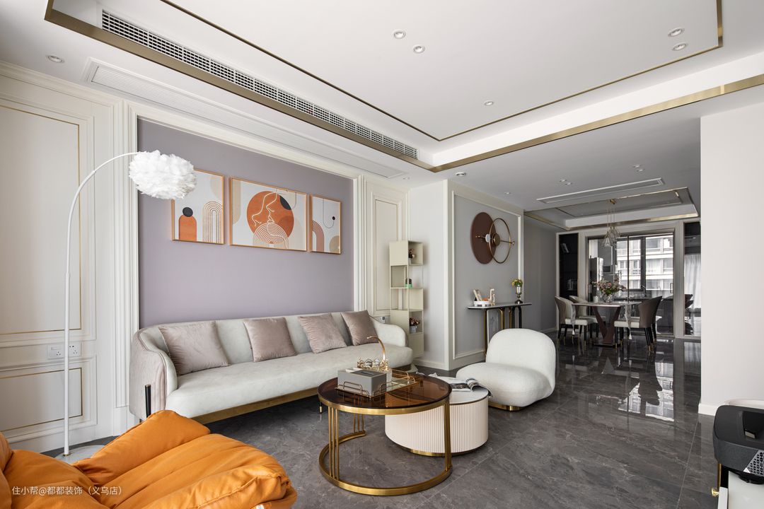 客厅是自带温馨自然气息的美式田园风,灰粉的背景墙和装饰性的石膏线格调雅致又惬意,吊顶一圈金属边框低调不浮夸,给人一种很出色的视觉效果。 白色纯美的石膏板、豆沙粉的乳胶漆,素色与灰色的沙发相得益彰,搭配羽毛落地灯、几何装饰画和茶色玻璃组合茶几,赋予空间平衡之美。 简约的沙发摒弃一切烦琐和奢华,去掉堆砌的颜色和摆设,让会客空间十分大气,别具轻奢魅力,在这样客厅中,钱女士既可以享受属于自己的静谧时光,又能与亲朋好友相聚一堂。 在美式风格的居家场景中,线板造型绝对是经典元素之一,吴设计师在背景墙中,大量使用环保的石膏线,透过最原始的白色呈现,平行与直接的线条相互呼应,与爵士白的岩板相配合,为整体空间营造了极致唯美优雅的居家风情。