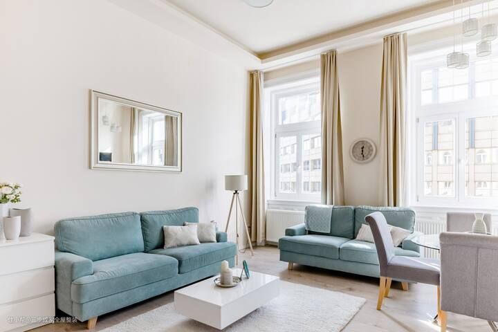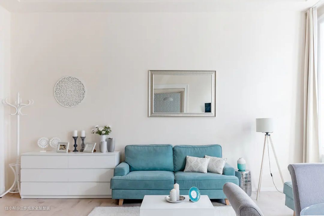 这个客厅设计亮点在于简约大气的装修风格、色彩搭配以及材料选择。 客厅装修简约大气,没有过多的装饰,让人感到清爽舒适。地面采用浅色大理石地砖通铺,这种材质和颜色的选择让整个房屋看起来通透又明亮。其次,蓝青色布艺沙发与白色米白色大地毯的搭配非常和谐,这种颜色搭配让客厅空间更加温暖舒适。同时,沙发的布艺材质也给人一种柔软舒适的感觉。整屋采用白色乳胶漆通刷,这种简单的装修方式不仅让客厅更加明亮,也增强了整个房屋的统一感和整体感。