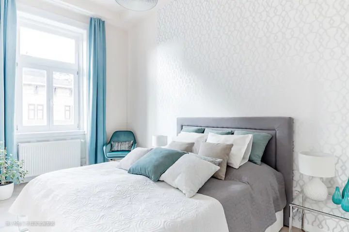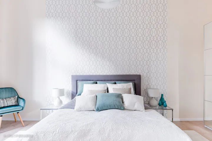 这个主卧室设计亮点在于极窄柜和床头背景的设计以及色彩搭配。 主卧做极窄柜,柜门做玻璃门设计,既能做柜门,又能照镜子,方便日常使用。这种设计方式不仅增加了储物空间,同时也让整个卧室空间看起来更加明亮、通透。卧室床头背景采用线条纹理设计,简约又有设计感。这种设计方式不仅增加了卧室的空间感,也让整个空间看起来更加时尚、有层次感。最后,卧室采用客厅同色系搭配,蓝青色抱枕让卧室空间更加有活力。这种色彩搭配不仅让整个空间看起来更加协调、统一,同时也增加了卧室的温馨感和舒适感。
