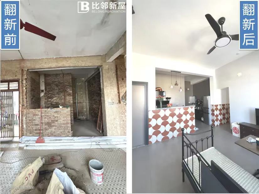 装修后:原来封闭式的厨房采光和通风都不是很理想,于是我们就根据现场实际情况去规划空间拆砌墙体做成半开放式的厨房,直面客餐厅,这样通风和采光也得到了解决。拆除原灶台定制橱柜,做饭的空间也大了不少,操作也更方便了;灰色的橱柜搭配跳色的瓷砖是厨房里一抹温馨的色彩。
