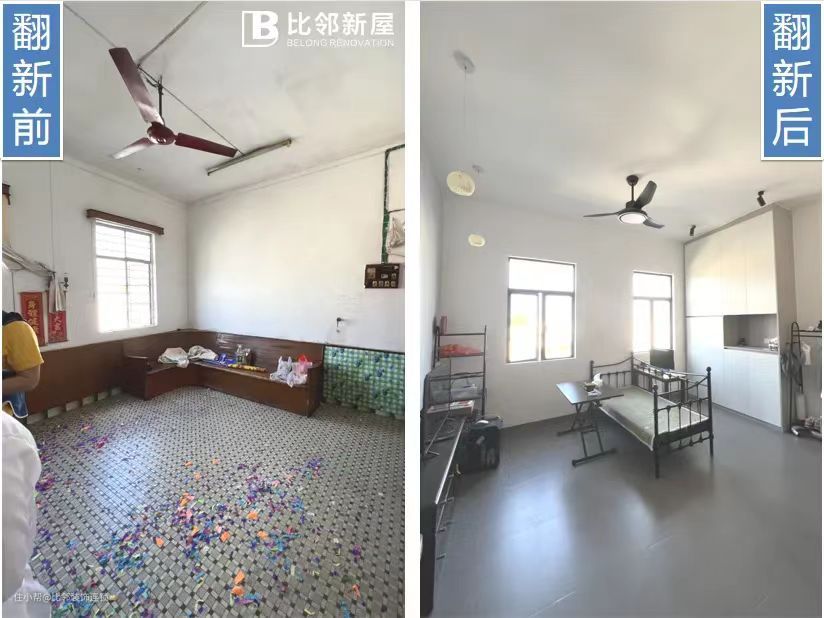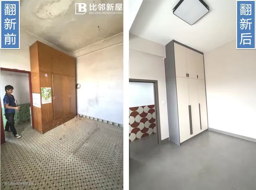 装修后:卧室全屋墙面重新扇灰油漆,墙面掉落、开裂等现象完美处理掉。地面一改之前老式地砖选择全屋铺灰色地砖方便日常清洁搞卫生,通铺地砖大气又简洁。原来的柜子顶部容易藏灰不好打扫卫生于是定制到顶衣柜放被子的空间非常充足,再也不怕藏灰啦。过道的墙裙由马赛克换成了红白拼色瓷砖,与厨房相呼应,整体空间感更强。