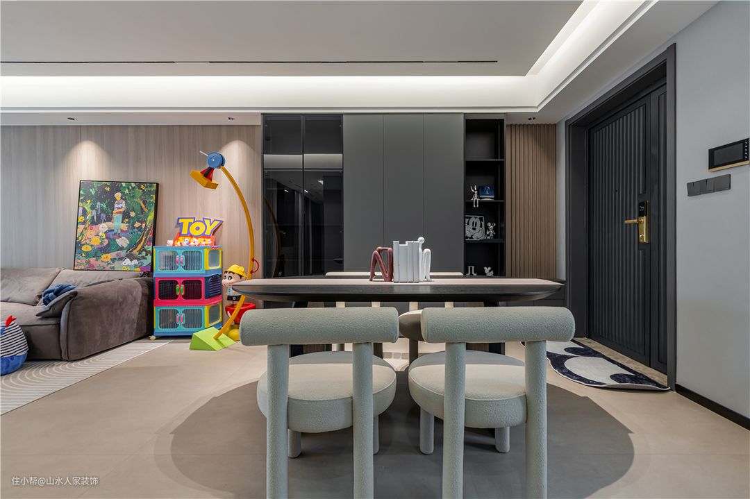 客餐厅实现了开放式布局,整个公共区域化零为整,几乎完全开敞。在流动的空间里,散发着沉稳大方的气质。头顶的无主灯更是点睛之笔,营造更多氛围感。 餐厅选用黑色岩板餐桌,椭圆形桌面打破方正格局,装饰性强。而浅灰色圆饼椅采用布料材质,坐感格外舒适,非常方便业主日常摇人聚会、用餐。