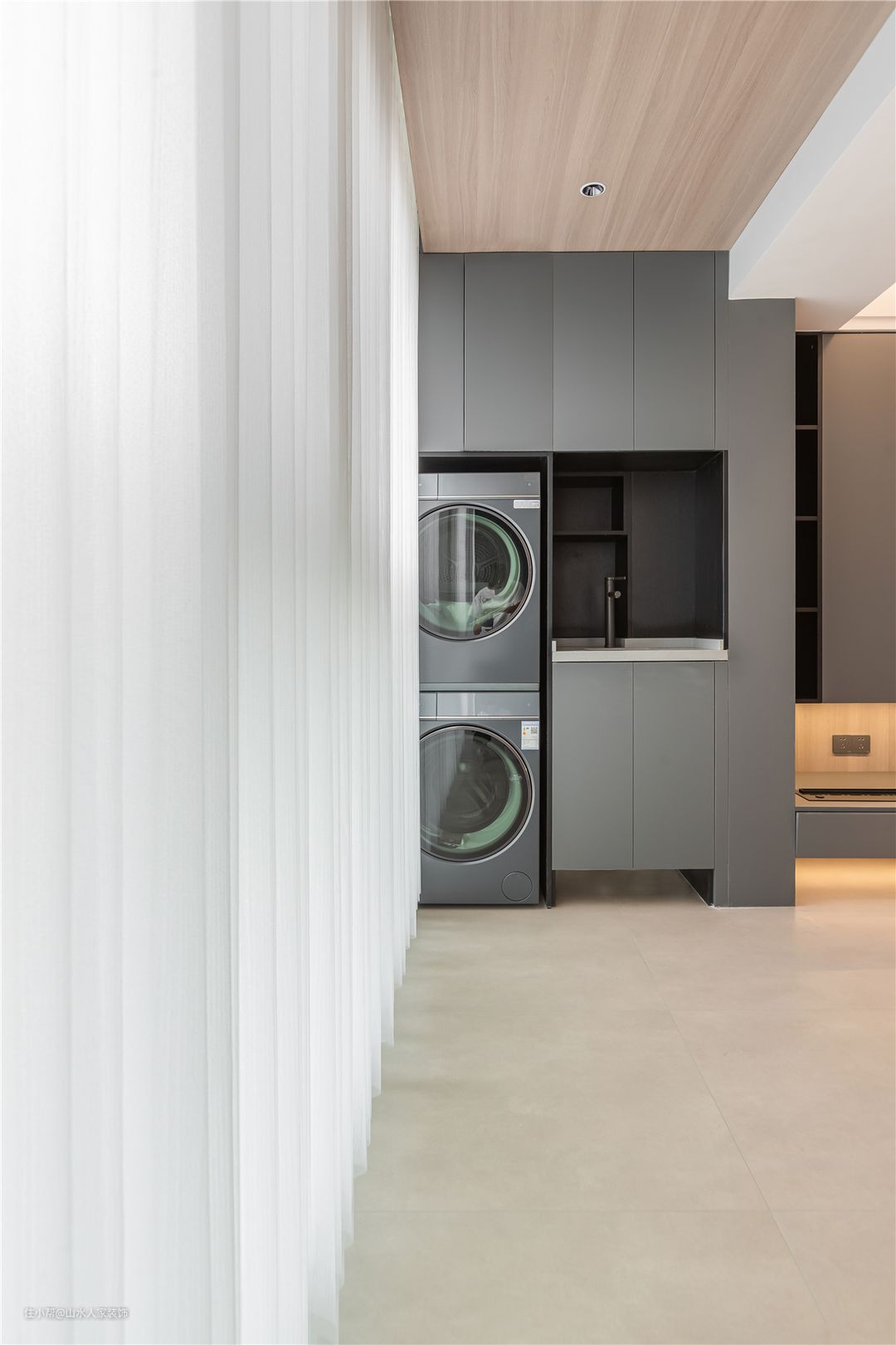 悬空电视背景墙居中嵌入电视机,满足观影需求的同时又很显简约大气。整体灰色柜面提升了沉静质感,搭配不同色彩的玩偶,使空间呈现出摩登气质。 阳台过道略长,直接连接了客厅及次卧,整体形成溯回动线。顶部选用实木材质,同地面保持一定的协调性。阳台合理归置了洗衣机烘干机+洗手池,相应满足业主的实际生活需要。