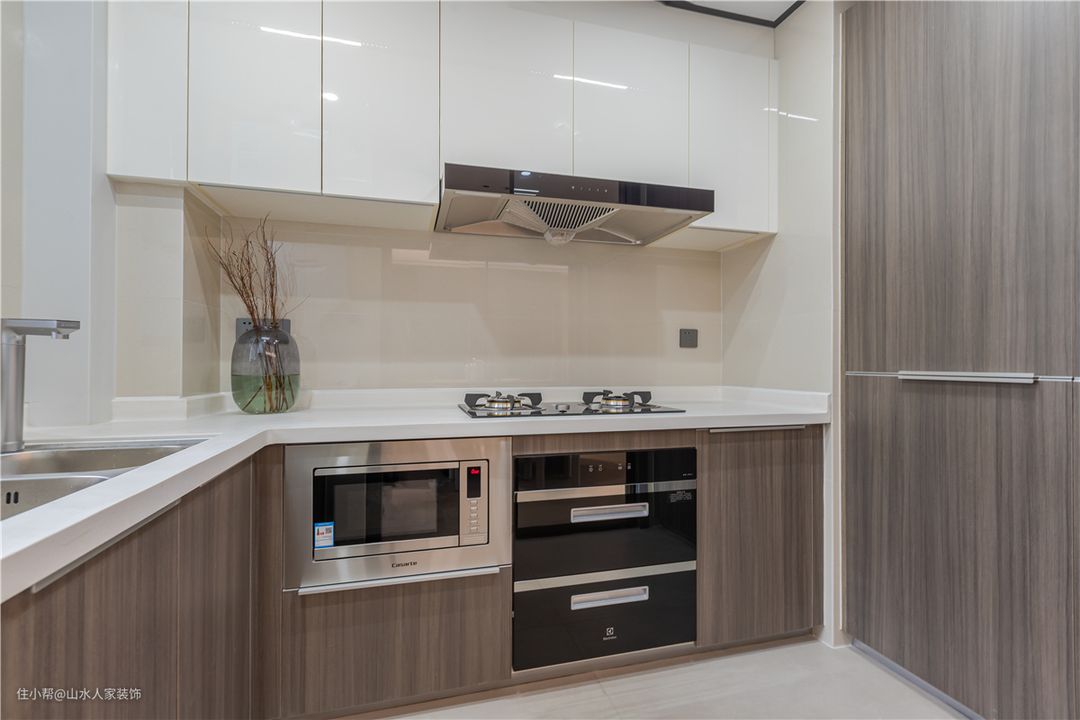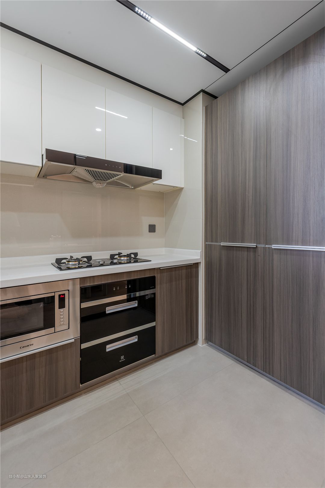 除此之外,木色橱柜的选用,使整个厨房看起来干净又整洁。侧面内嵌了冰箱及烤箱,更好节省空间,同时保持了色调的一致性。上方吊柜则选用浅白色系,进而平衡了厨房的简约造型。