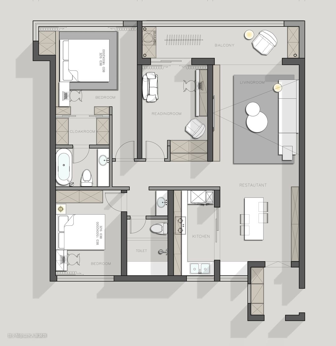 本案户型方正,南北通透,尤其业主对居家舒适性有着极高要求,对房屋结构进行了个性化的改造,主要包括:(1)打通客厅和阳台,同时连结次卧,整体形成溯回动线;(2)主卧做成套间样式,内部包含了步入式衣帽间;(3)卫生间干区外置,很好地实现了干湿三分离。