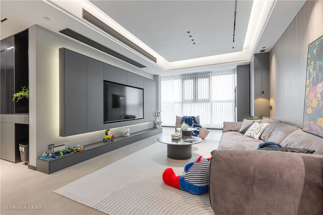 阳台完全融入客厅,大幅增加了使用面积。一整面落地窗搭配白色纱帘,迎来丰富的日照采光。地面通铺浅色系地砖,整体沉淀着简洁纯粹的基调。 全房定制了无主灯设计,线条灯隐藏其中,沿着吊顶轮廓渐次排布开来,凸出方正的线条美感。轨道射灯进而补足照明功能,便于业主在不同居家模式下找到自己最舒服的光源。 木饰面做背景墙,墙面更显温馨高档。同时定制了灰色悬空柜体,功能与颜值兼具。选用大象耳朵沙发搭配黑色岩板茶几,打造出轻松、慵懒的客厅空间。加上各种玩偶摆件及彩色落地灯的点缀,攫取更多视觉焦点。