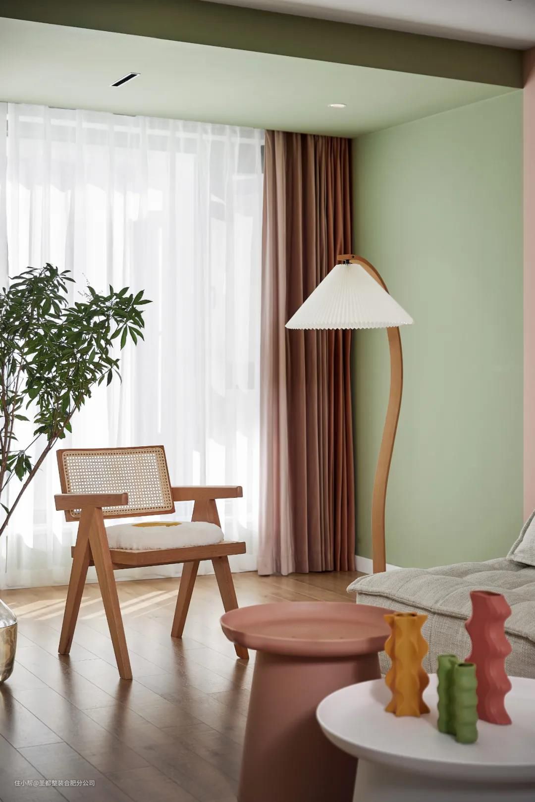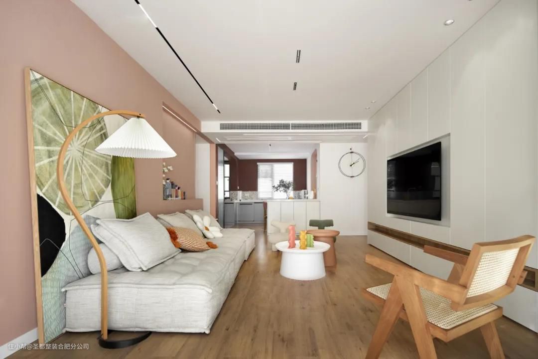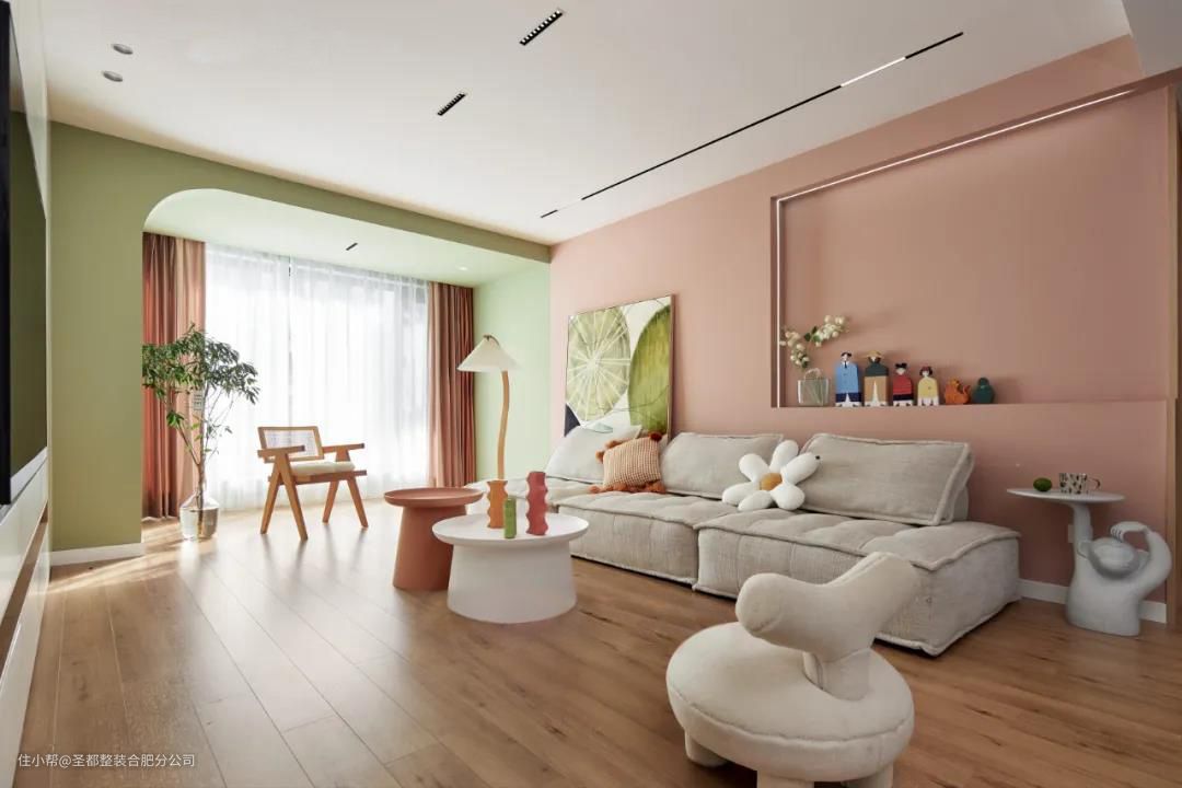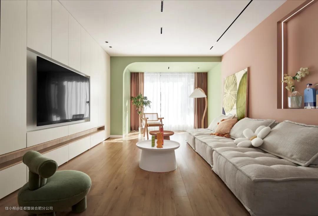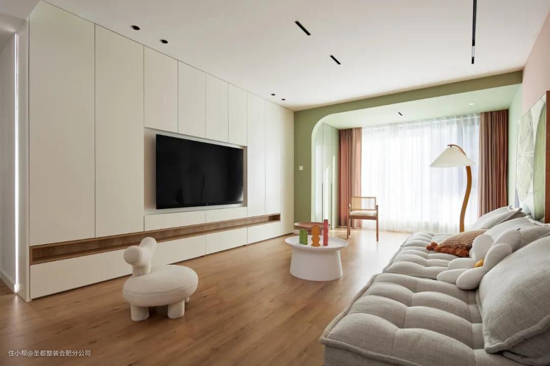 房东拥有两个大眼萌娃,所以全屋围绕着童趣展开设计,处处充满活力。温甜不腻的抹茶绿纳入眼底,沙发背景做了半墙开放式收纳台,用心爱的小玩具作为装点,谱写宛若童话的音符。 原木色的地板搭配有色乳胶漆,无主灯设计+大落地玻璃。综合人工照明+自然采光为一体,轻氧感满满的家,四季如春。电视背景以整墙收纳柜体呈现,告别杂乱无序。穿梭过西柚色的多功能墙面,在百褶落地灯下晒个月光。 家居生活中那些直抵人心的舒适,往往是摒弃繁冗修饰后的洗炼。阳台扩入客厅,让原本局促的空间变得更加宽敞明亮,配合完美的落地玻璃,屋外的蓝天白云似在眼前。 洗衣机及烘干机直接藏在绿色柜门后,摈弃传统外置晾晒方式。兼顾实用功能的前提下,也完全不影响阳台的整洁性。白纱随风而动,漫过慵懒的竹编椅,关于小日子的颂歌藏于指缝间。