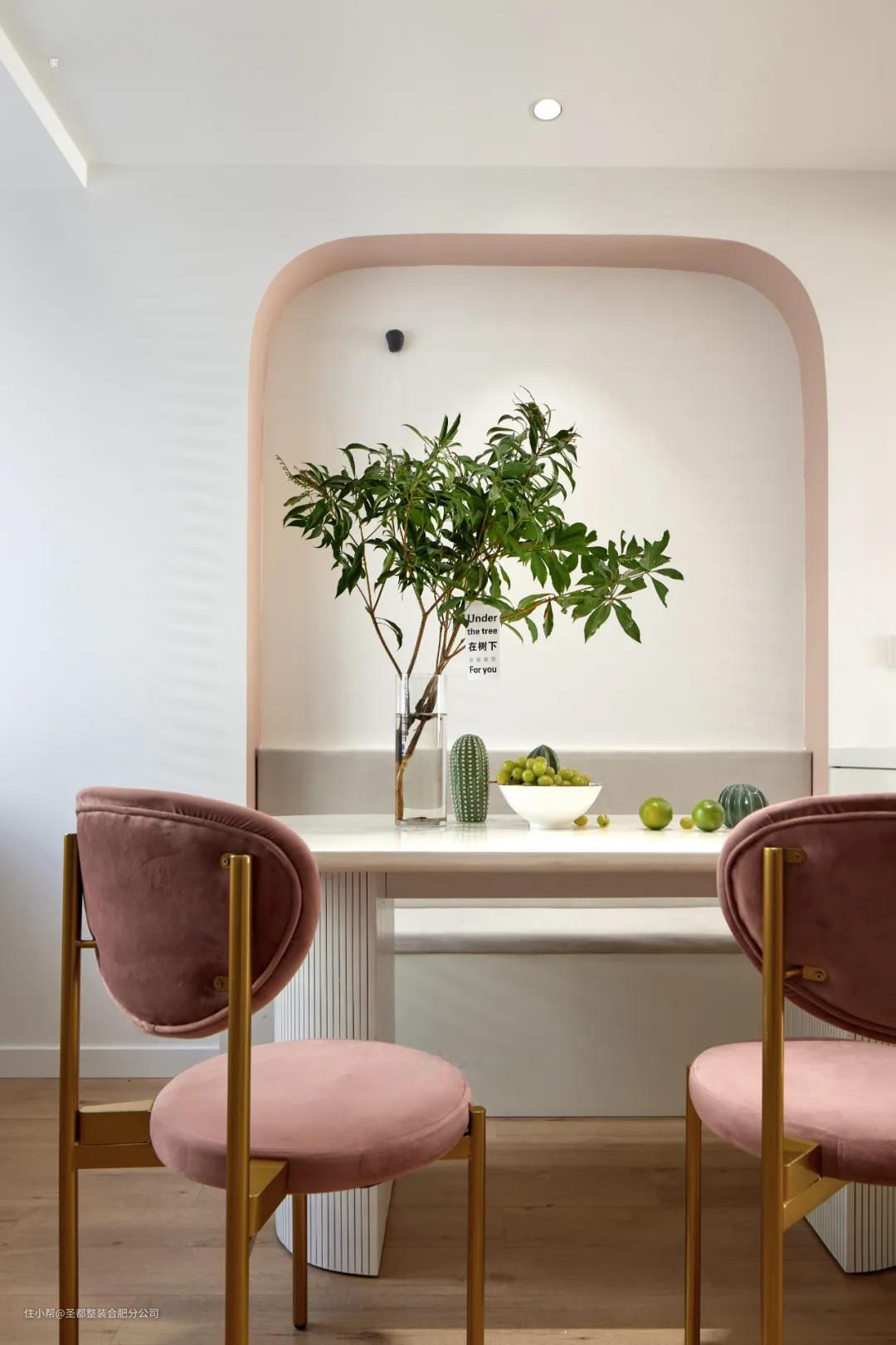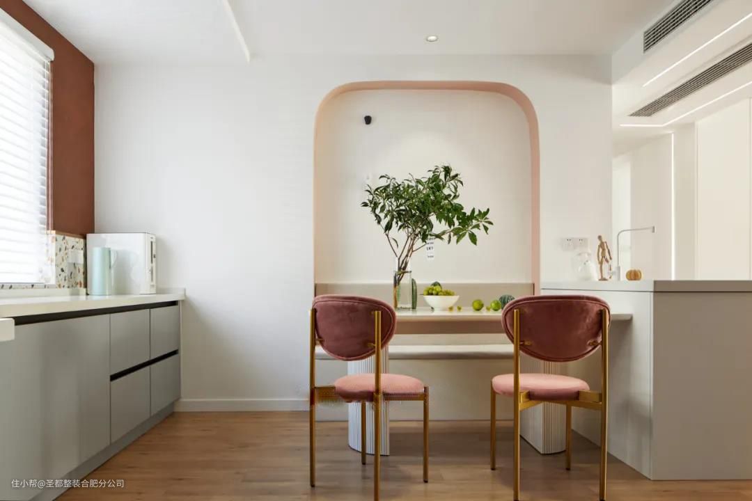 原始餐厅两边过道空间紧凑。通过卡座形式,可往书房借用部分墙体空间,同时化双通道为宽阔单通道。靠窗做了一个水吧台,与厨餐区域共享视角,形成西点制作的一个平台,营造融洽休闲的家庭互动氛围。 弧形的造型与阳台造型相呼应,甜而不腻的西柚色仿佛自带香气,使人情不自禁地“闻香识生活”。