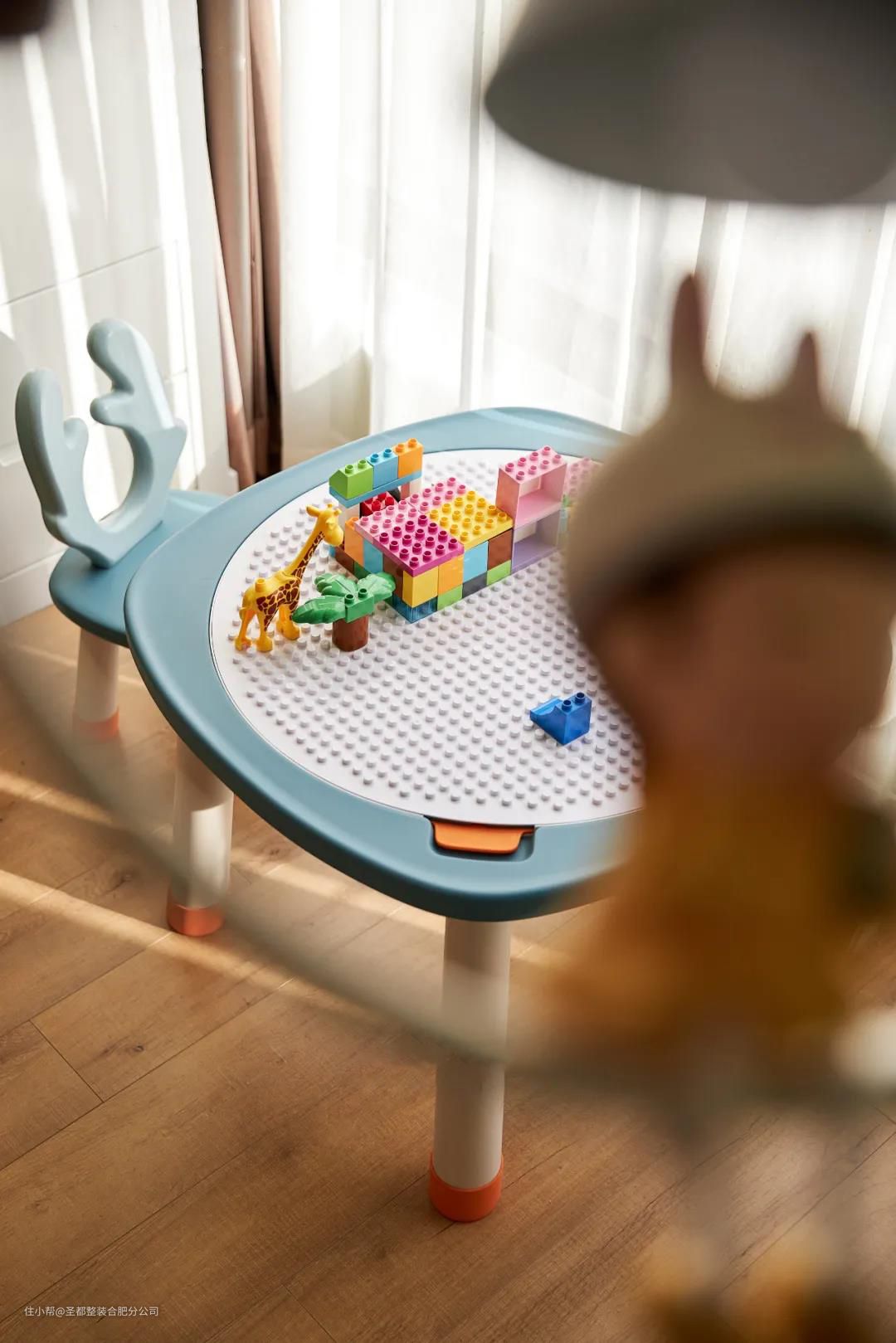 儿童房硬装干净简洁,是娱乐与学习的梦幻世界。可随着孩子的成长,保留空间的改造可能,通过软装的改变切换功能区。 房间数量满足必须的情况下,还需要儿童娱乐及学习区。所以将两个阳台打通包进室内,充足的储物空间,可以满足自己囤物爱好,及两个萌娃的日常玩具。儿童沙发造型充满创意,可以让小朋友坐在上面画画、读绘本,还可以爬上爬下地玩耍。 玩具桌上没搭完的积木,甜度超标了。关于小朋友的一切都是可可爱爱。