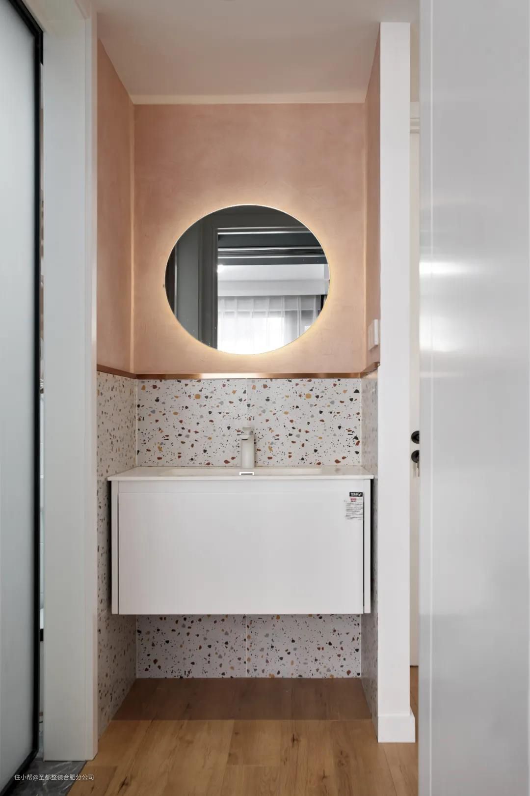 次卫使用频率高,原始次卫空间偏小,需要通过干湿分离来扩大卫生间面积,提高使用率。次卫的地面通铺小花砖,清新不失浪漫,与淋浴配件相辅相成。半墙主义的设计,精致值拉满!