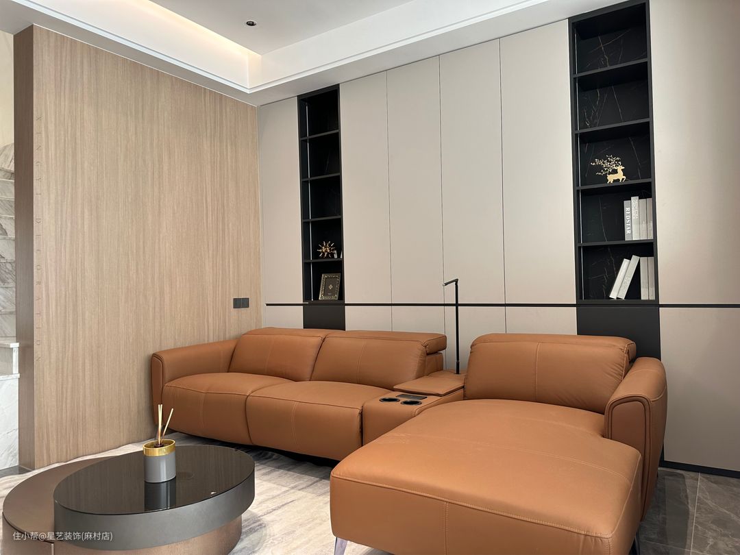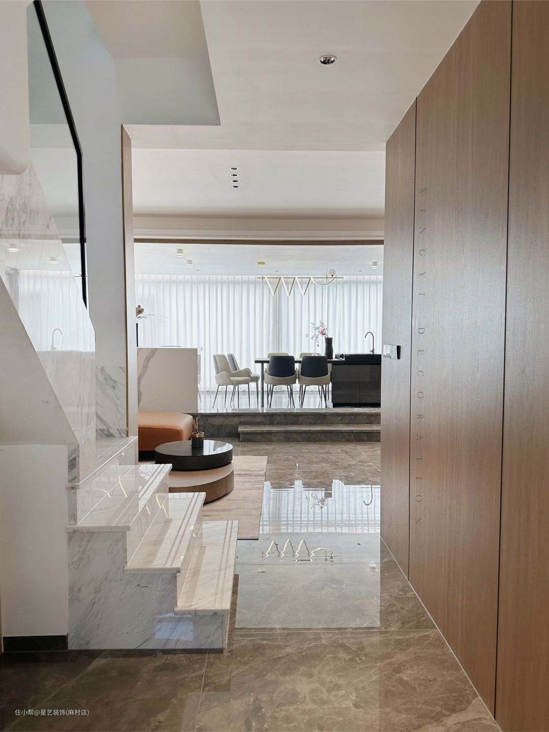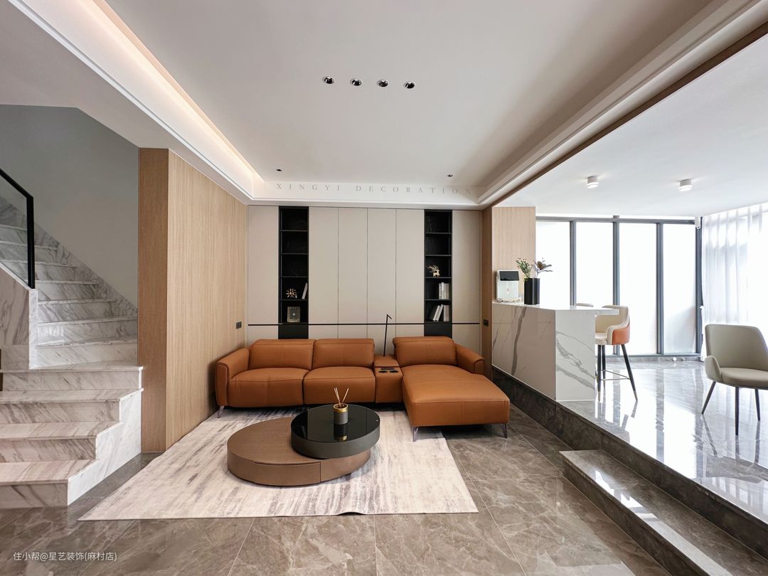 客厅明亮宽敞,自然光线充沛,在浅色的主色调中,佐以深色家具点缀其间。让光影映照于室内,有着不同的流动面貌,台阶上下突显出空间的层次感。