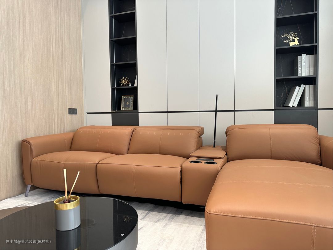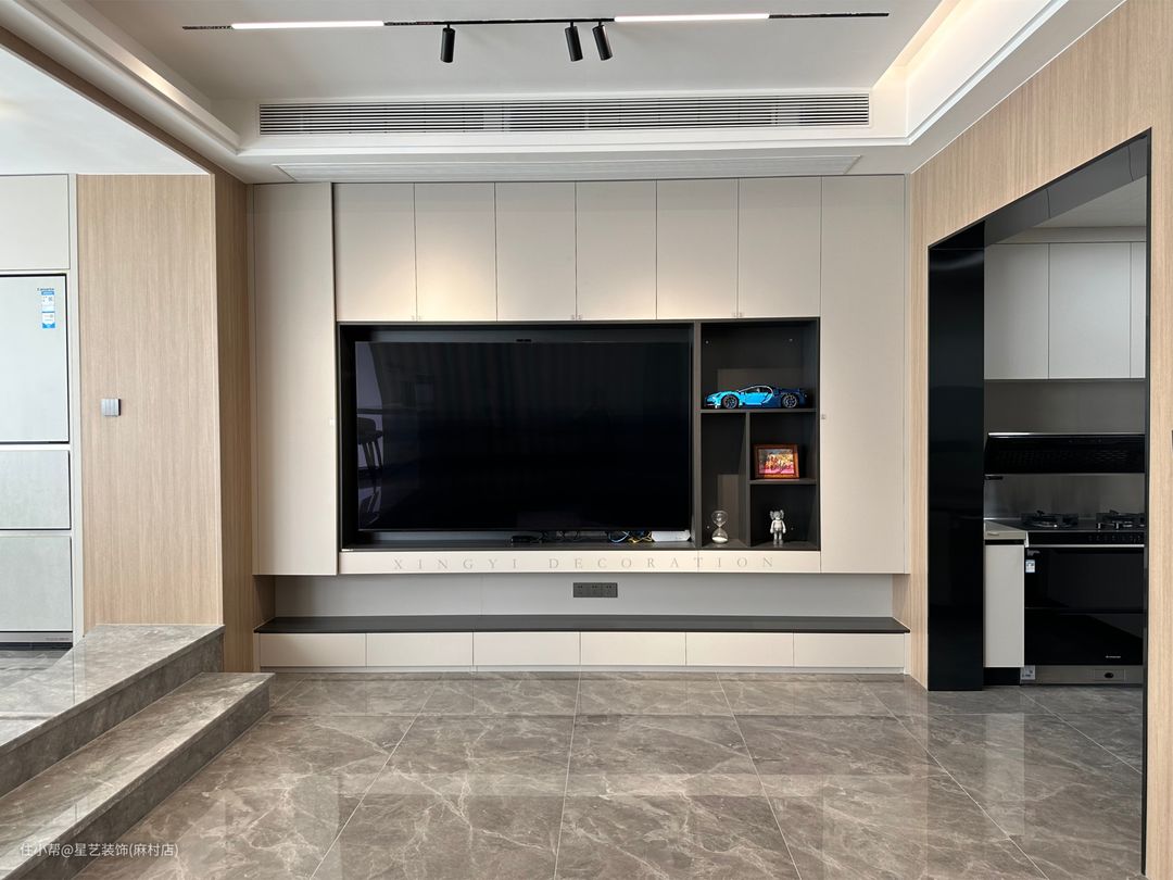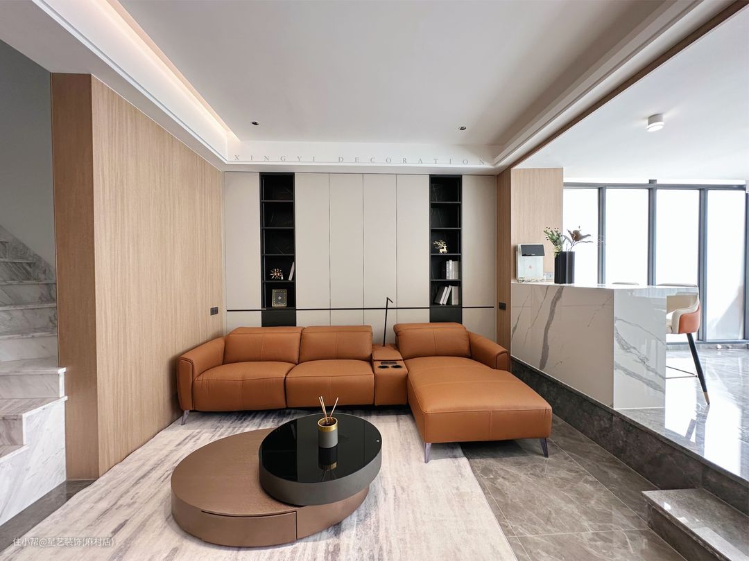 客厅明亮宽敞,自然光线充沛,在浅色的主色调中,佐以深色家具点缀其间。让光影映照于室内,有着不同的流动面貌,台阶上下突显出空间的层次感。