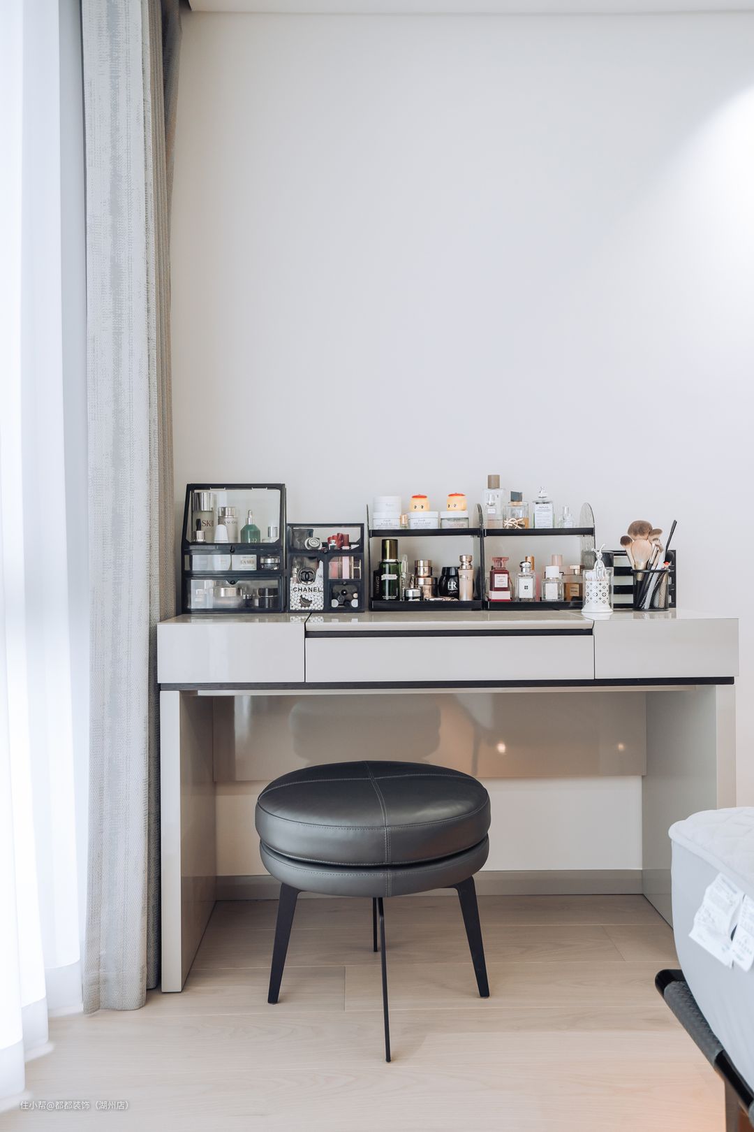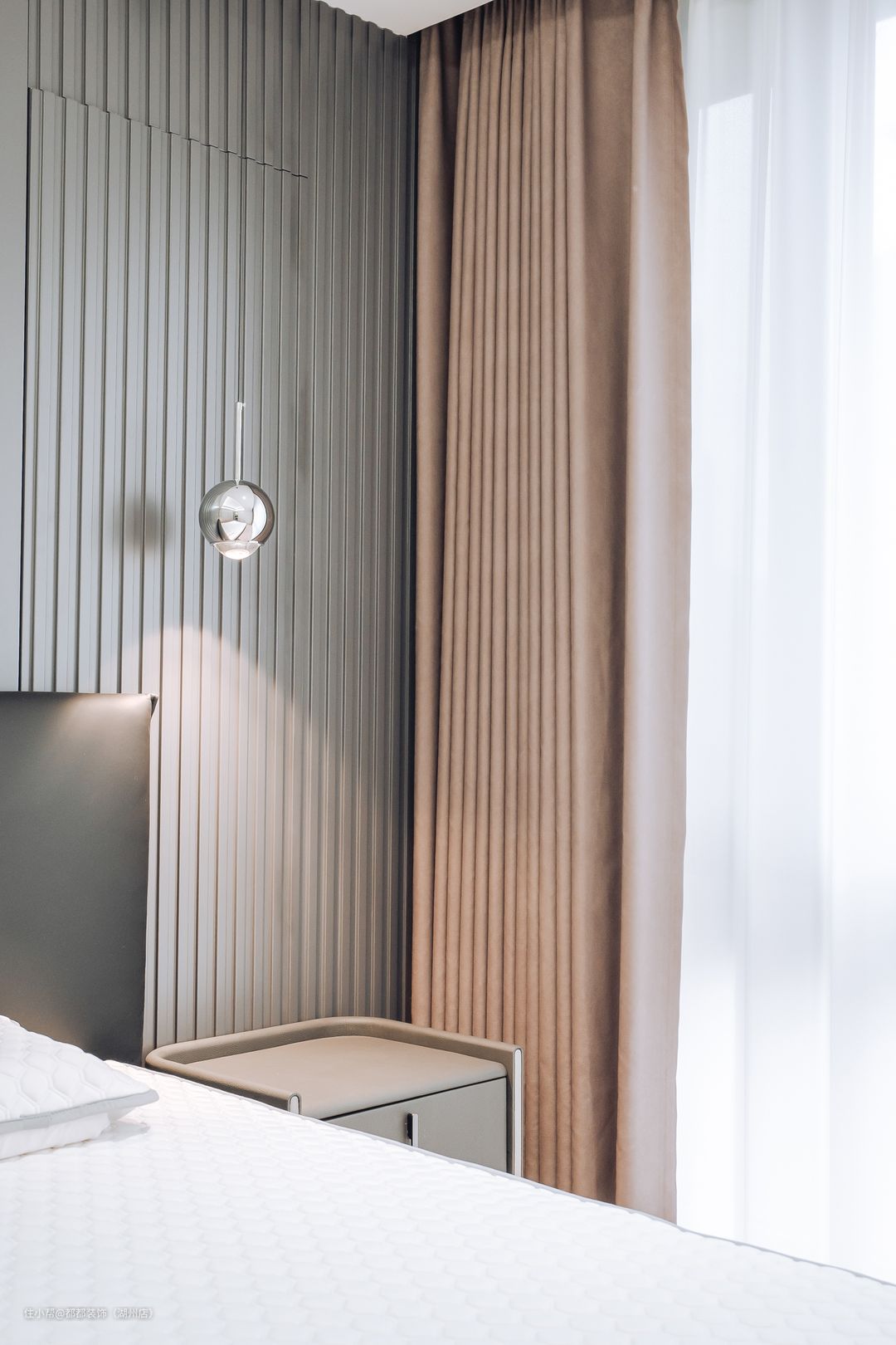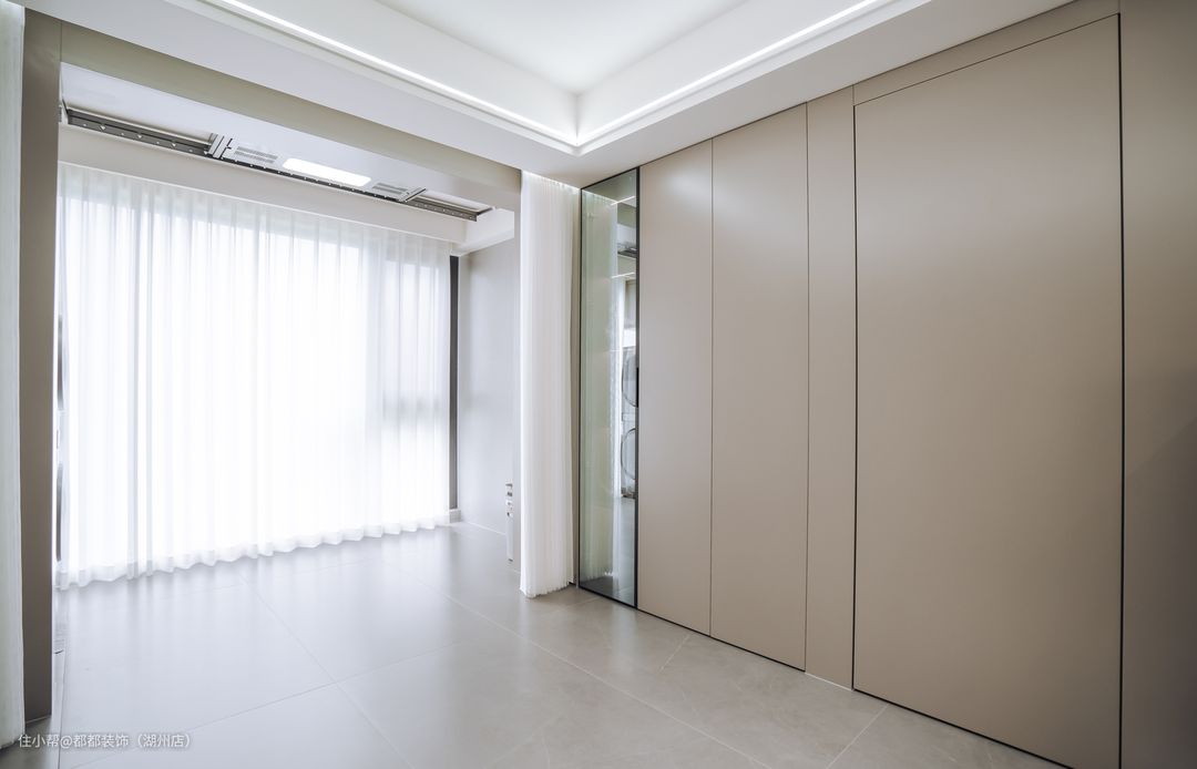 灰色和奶茶色主导的空间,打造沉浸式入梦空间,加上飘窗处引入的和煦自然光,睡眠空间自带温柔滤镜,对称黑色高级床头柜摆上小摆件,心被漫进的自然光线包裹,舒适又温暖。 床尾空间利用,简约梳妆台,使得卧室整体更加协调。 整墙一门到顶衣柜,选的浅灰色,并且是无把手设计,弱化存在感,但是收纳增强。