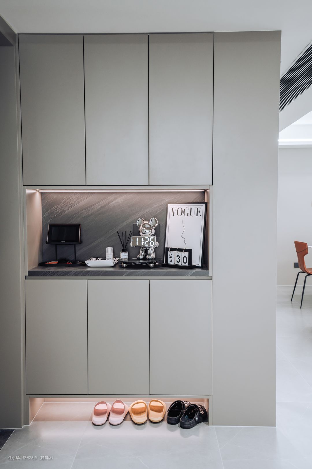 入户设计玄关鞋柜,进门通顶高柜搭配悬空柜,穿插设计,防止视觉上太过压抑。背景墙使用胡桃木色格栅板,搭配暖色灯光更新柔和高级。底部悬空,方便日用拖鞋摆放,视觉上也更干净。中间木纹套格设计更具空间层次感,预留一个插座可以日常给充电宝充电,出门直接拿取很方便。台面上也可以摆放装饰画增添生活氛围感。整体免拉手设计更显高级大气,也能避免慌忙出门时的无意间磕碰,与拉手对衣服的勾挂。