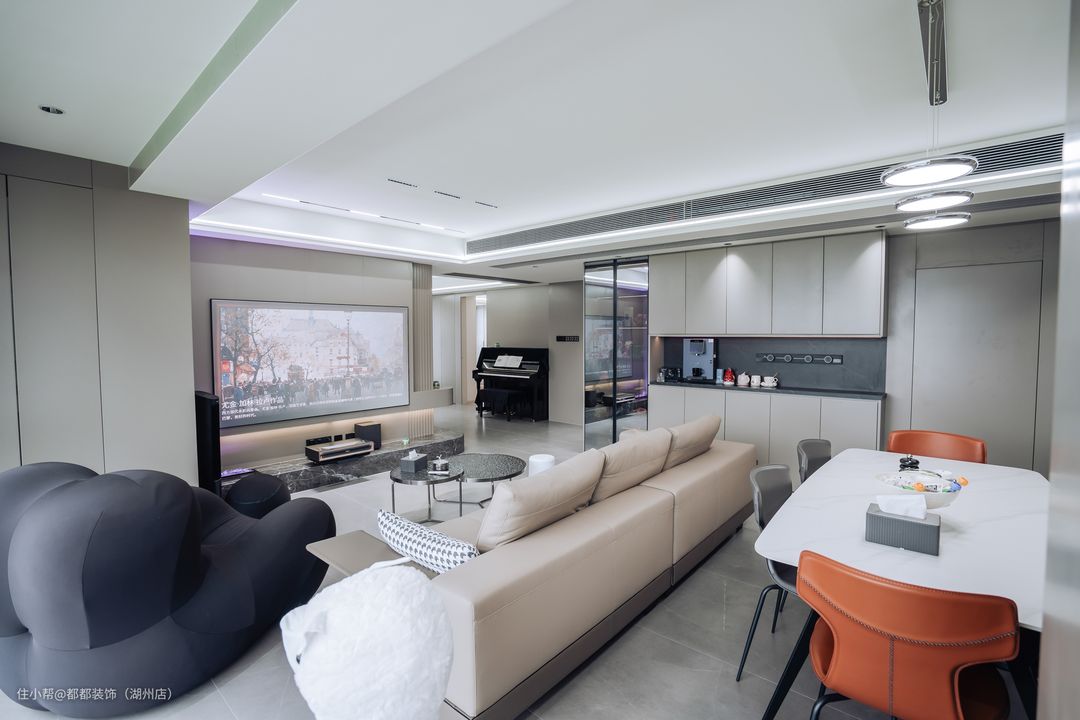 全屋均安装无主灯照明和智能家居系统,可自由掌握家中灯光、温度,居中磁吸轨道灯对称排列,并加以防眩射灯集中照明,磁吸轨道灯+小山丘射灯+筒灯+led低压灯带,磁吸轨道灯里面嵌入了泛光灯、格栅灯和明装射灯,因为是磁吸设计,所以可以随意挪动位置更换光源。 电视背景墙:欧松板打底+石膏板+刮腻子+刷杏子灰乳胶漆,简约耐看又显宽敞。立式空调高级提升整体氛围感。 选择了米白色的沙发做对比色,真皮质感搭配造型简洁的茶几,同时,它的米白色外观也能够与意式轻奢风格相结合,为家居装饰增添一份简约与美感,提升了客厅的空间感,也体现出主人的品味~再配上网红沙发“妈妈的怀抱”,无论是在忙碌劳累之后需要休息放松,还是想找一个安静阅读或独自思考问题时,在这个单人沙发上可以得到宁静与平和。 敲掉的衣帽间墙体处做了弧度玄关来弱化进门对墙角的直觉感,弧形隔墙似有曲径通幽之意,简约流畅的线条丰满了玄关造型。钢琴放置以对称形式呈现出一种阵列式秩序感,使得光线进入玄关,既在视觉上延伸了空间又解决了玄关采光的问题。