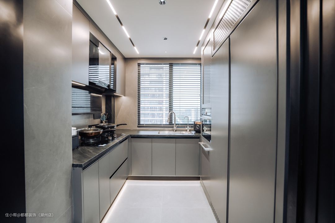 厨房没有多余的阻隔,大理石墙面、高级灰橱柜组合成空间的体块,有一种低调简约的质感,U型的对称布局增加了操作台的面积,放眼望去有一种协调的美感,采用百叶窗,透光透亮,厨房虽小但五脏俱全,功能齐全。