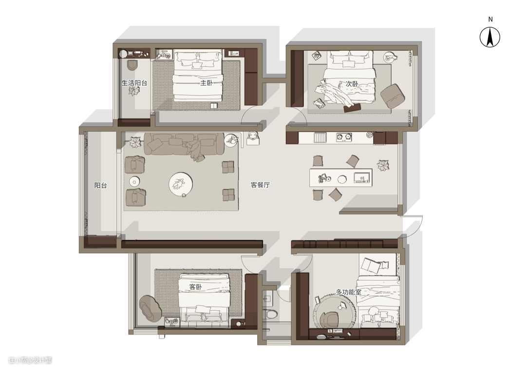1、重新布局空间形态,完善并独立玄关与休闲办公区域的空间属性; 2、拆除厨房门垛,扩大厨房的可利用面积,使餐厅和厨房相连起来; 3、调整卧室的入口位置,将长辈房布局在公卫附近,提高居家便利性; 4、将主卧门向外推移,缩短了公共通道,利用墙体的优势打造成衣柜。