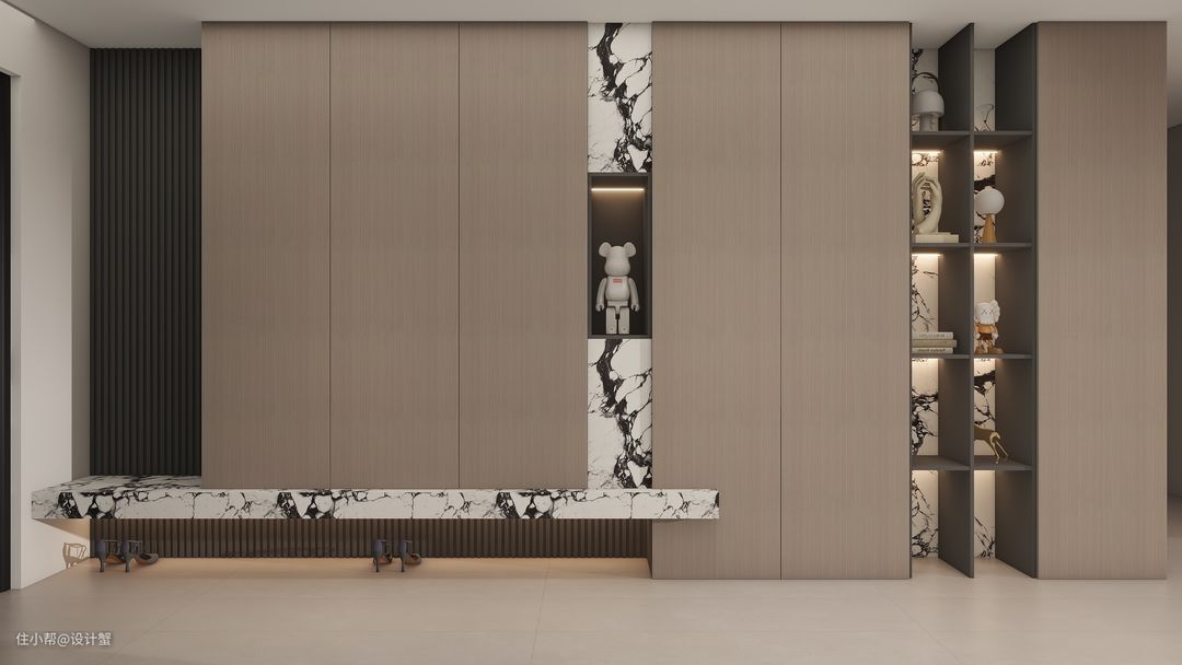 居住空间常常反映着主人的性格与气质,从入户走廊踏入客餐厅的第一眼便奠定了这个现代住宅的基调,所以色调感觉,材质运用和智能控制很重要~ 💗色调感觉&材质运用 材料方面选用宝格丽奢石与奶油原木面板搭配,温柔与质感并存,玄关美貌与实用并存,端景收纳都要有。