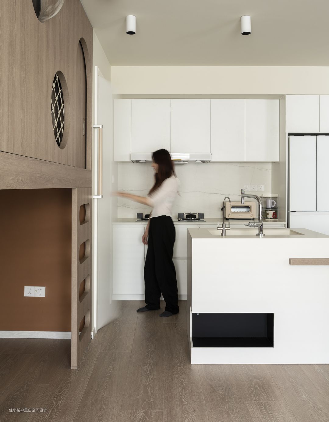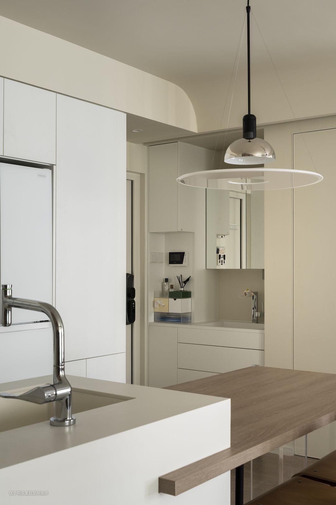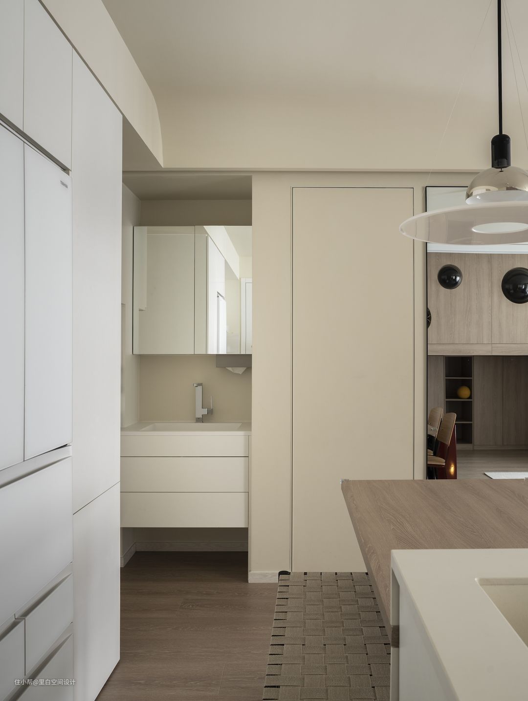 原户型是没有玄关的,一进门左通厕所,右接餐厨,储物功能缺失。改造后我们将厨房做成了开放式,橱柜连通入户区,尽头利用转角柜新增鞋子、外套的收纳空间。 为了方便做嵌入式冰箱,我们将玄关柜的进深做到了600mm。这样一来,如果是正常的柜子取深处的物品是会有点吃力的,所以我们将玄关柜一分为二,做双面可打开的转角处理,面向入户门一侧收鞋子,面向客厅一侧挂衣,动线也会更加流畅。 玄关处新增的洗手台,一定程度上缓解了业主一家四口如厕“早高峰”的困扰,同时也在后疫情时代为家建立起一道“隐形防线”,进门净手-消毒,干干净净地进屋。 洗手台左侧其实是管道井,我们借势做了个储物空间,下方凹槽处留白,方便业主进门随手放置钥匙等小件零碎物品。