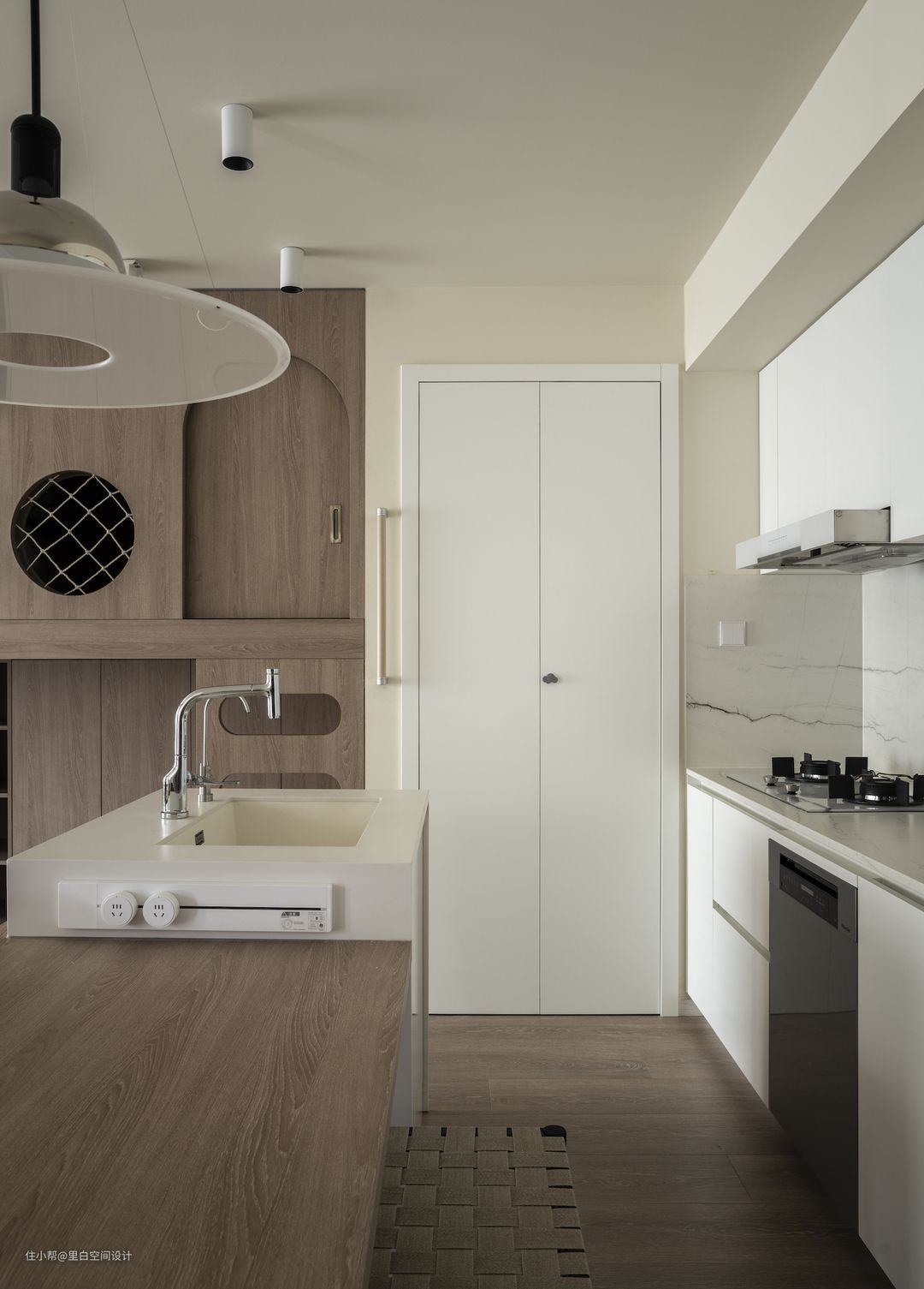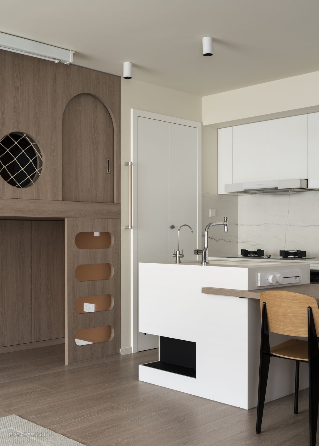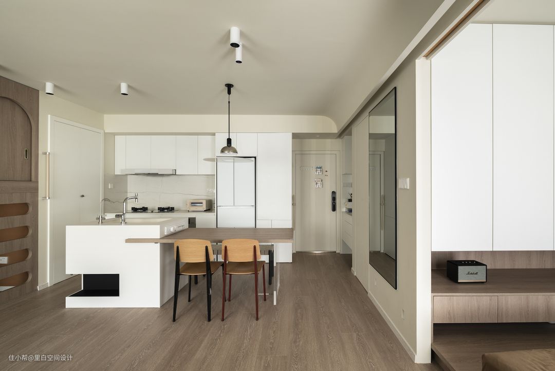 原户型是没有玄关的,一进门左通厕所,右接餐厨,储物功能缺失。改造后我们将厨房做成了开放式,橱柜连通入户区,尽头利用转角柜新增鞋子、外套的收纳空间。 为了方便做嵌入式冰箱,我们将玄关柜的进深做到了600mm。这样一来,如果是正常的柜子取深处的物品是会有点吃力的,所以我们将玄关柜一分为二,做双面可打开的转角处理,面向入户门一侧收鞋子,面向客厅一侧挂衣,动线也会更加流畅。 玄关处新增的洗手台,一定程度上缓解了业主一家四口如厕“早高峰”的困扰,同时也在后疫情时代为家建立起一道“隐形防线”,进门净手-消毒,干干净净地进屋。 洗手台左侧其实是管道井,我们借势做了个储物空间,下方凹槽处留白,方便业主进门随手放置钥匙等小件零碎物品。
