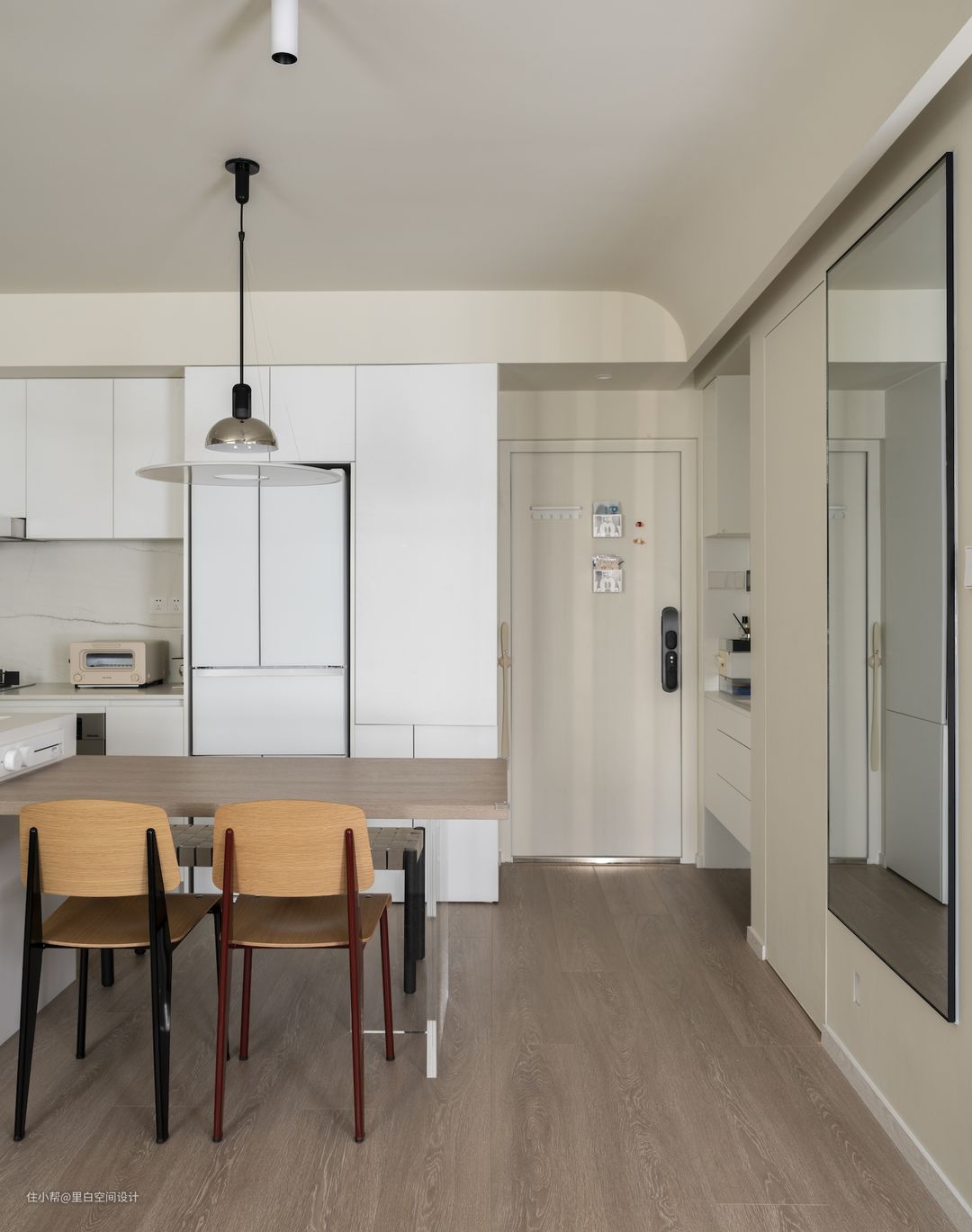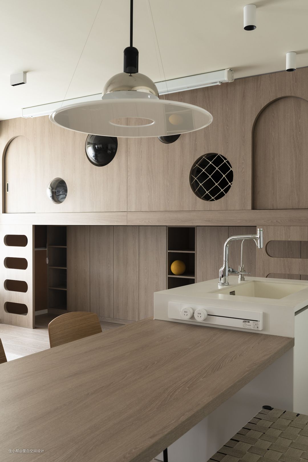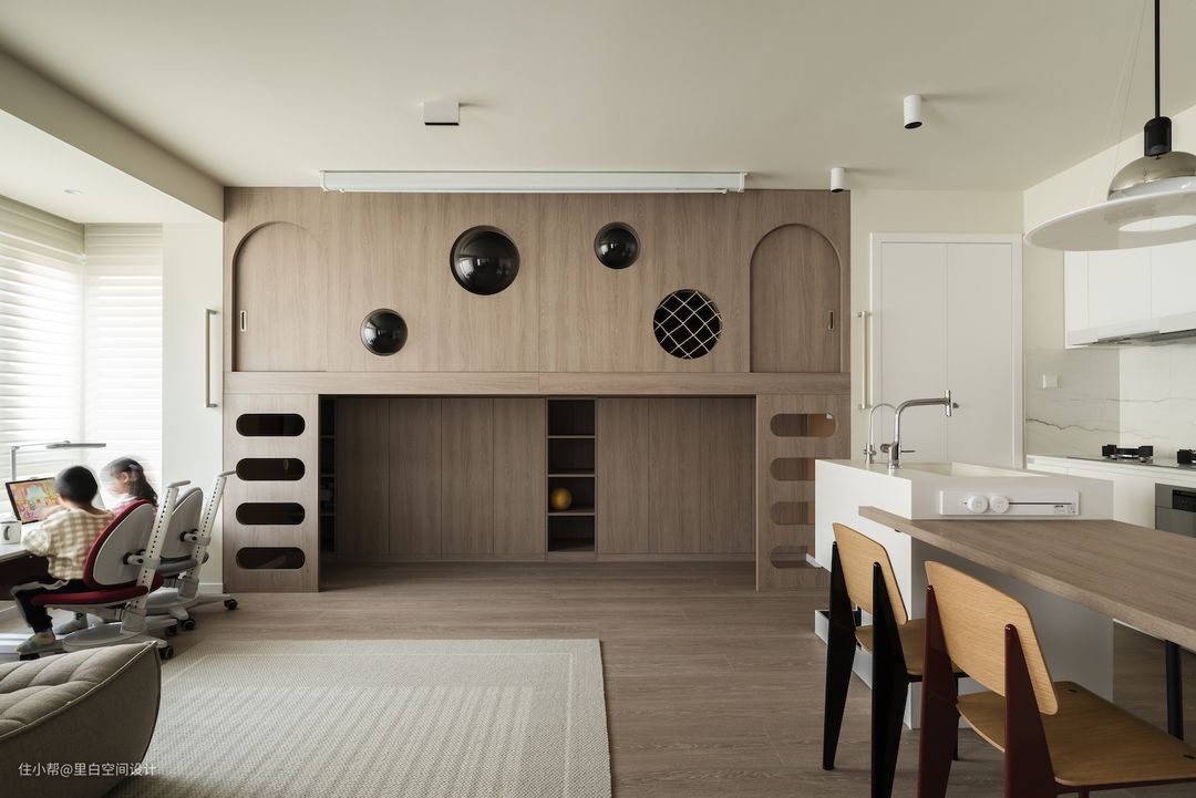 原户型本就是客餐一体的布局,改造时我们合并了厨房,做成了LDK一体的空间,各个功能区能相互借面积,其实无形中增大了各个空间的使用面积。公区以餐岛为中心形成高效洄游动线,串联起各个空间。 厨房虽小,“含金量”高。整个空间由下厨动线串联,取食材-清洗-备餐-炒菜动作流畅,菜品从出锅到上桌仅需转个身就能完成。餐区可供四人同时使用,厨房一侧特意选了&tradition的藤编条凳代替传统餐椅,让过道更宽敞。 厨房墙面及岛台外立面均为德赛斯岩板,材质上的呼应统一视觉,同时也方便日常打理。 中岛主要以水槽为主,内部安装净水系统,侧面加装轨道插座,方便咖啡机等小家电使用。业主一家平时以少油少盐的简餐居多,所以做开放式厨房也基本没有什么油烟的困扰,而且开放式空间会更方便照看小朋友。 客厅是平时一家人互动、孩子学习和玩耍的场所,业主不希望被太多家具束缚,所以果断舍弃了传统的沙发+电视的布局,留出宽敞的活动空间,方便一家人游戏互动。 为了保证客厅区域的机动性,特意选择了轻便好移动的沙发,同时以投影仪代替电视机,我们在儿童房顶面区域安装了电动幕布,正对主卧床,周末一家人能窝在沙发或床上看电影、动画片,当幕布收起,客厅又能一秒切换会客厅或游戏区。 小朋友在学舞蹈,所以公区也承载着一部分舞蹈室的功能,我们在玄关进入室内的动线上设置了一面全身镜,既能方便出门整理仪容,也能作为小朋友的舞蹈镜。 客厅采光最好的位置留给了学习区,两张可升降的学习桌并排放置在窗下,这样小朋友学习时室内也能保证有充足的光线进入。